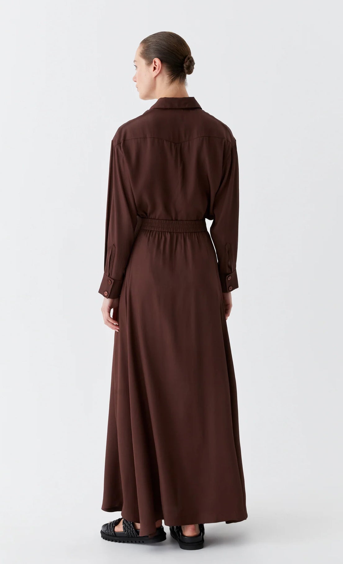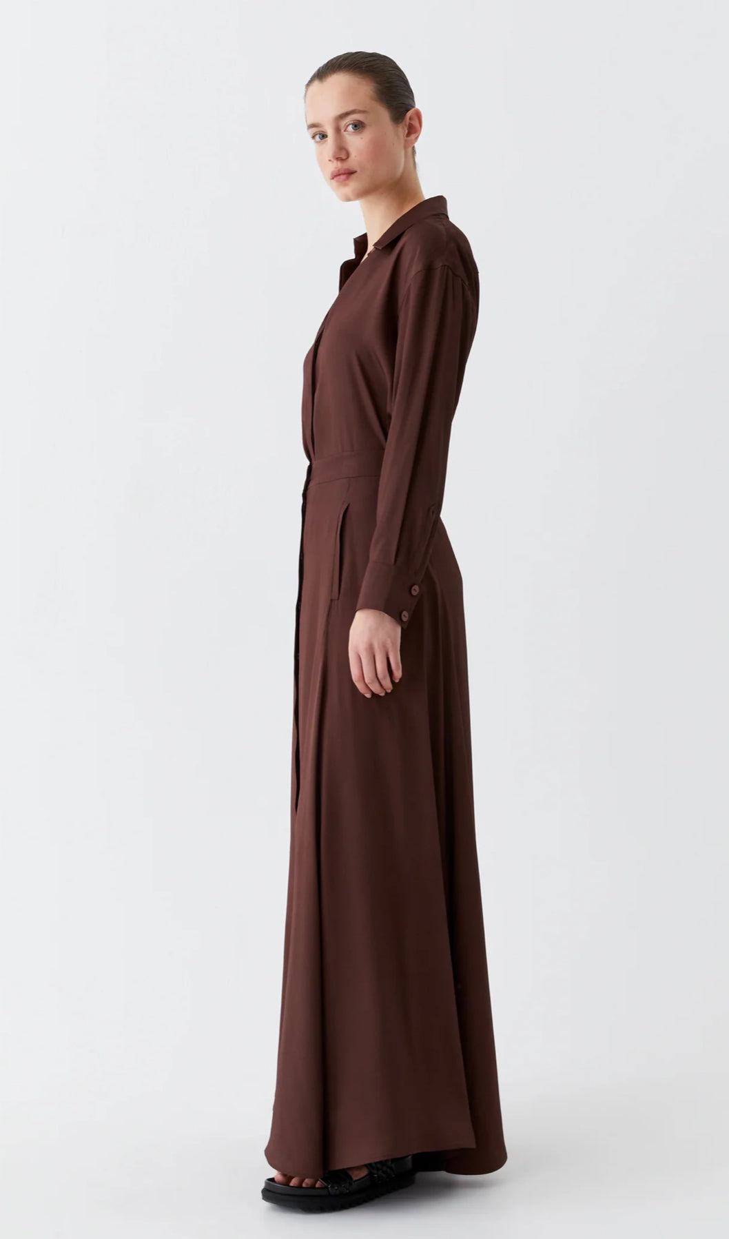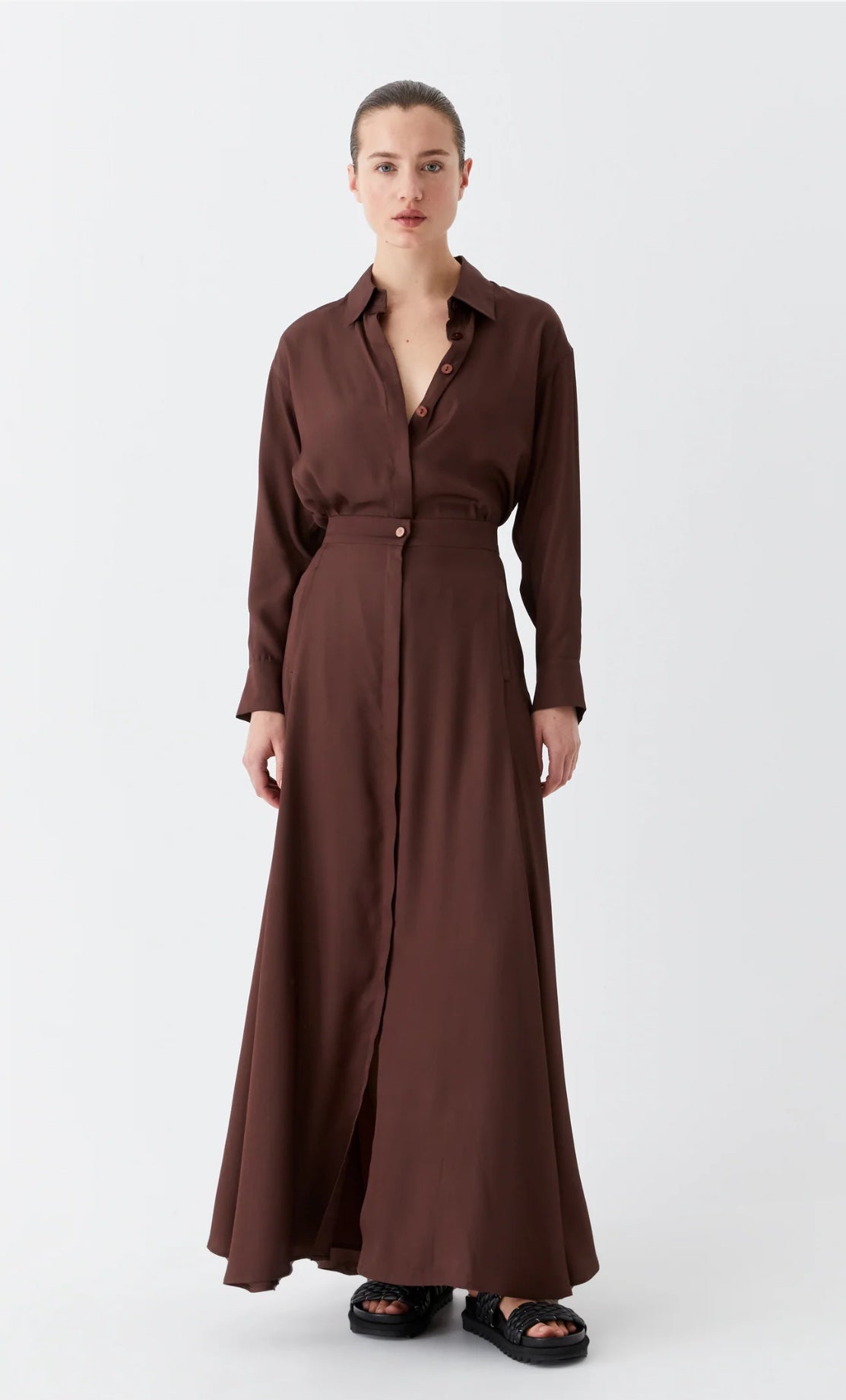 The Chloe Skirt is crafted from a premium silk-blend twill, offering a luxurious feel with effortless drape. This elegant maxi skirt features a high-rise waist, a concealed button placket, flat...