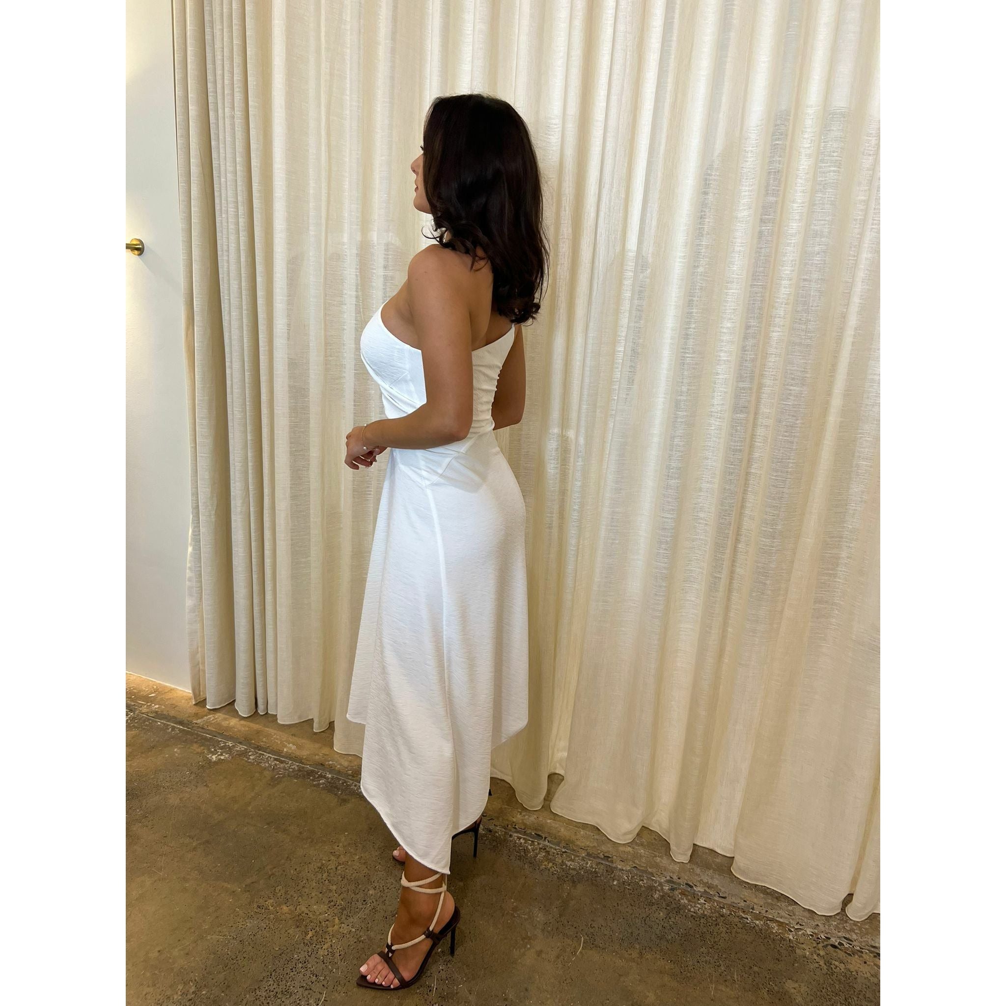 The epitome of elegance the Deity Dress sits high against the collar in a one-shouldered neckline with a thin, left bearing strap. Tailored to fit slim against the figure through...