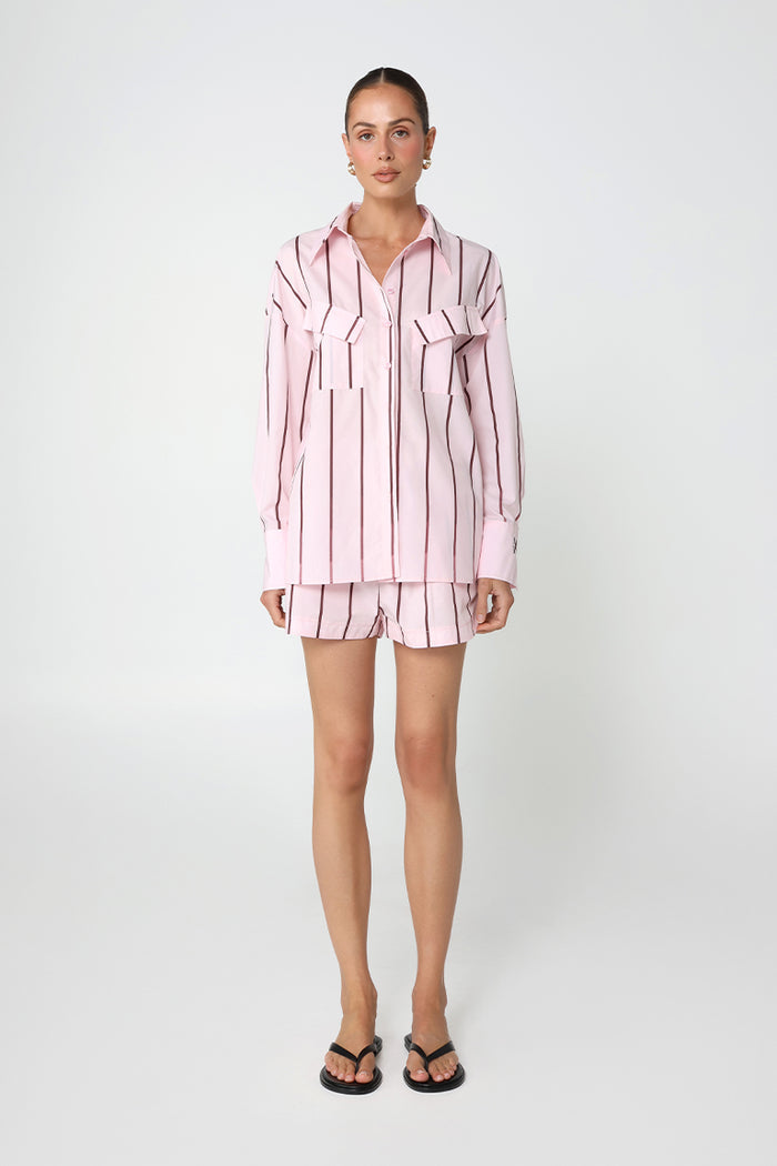 Pink and burgundy stripe relaxed fit shirt Front pockets with feature angled pocket flaps Logo embroidery on the cuff Button up centre front