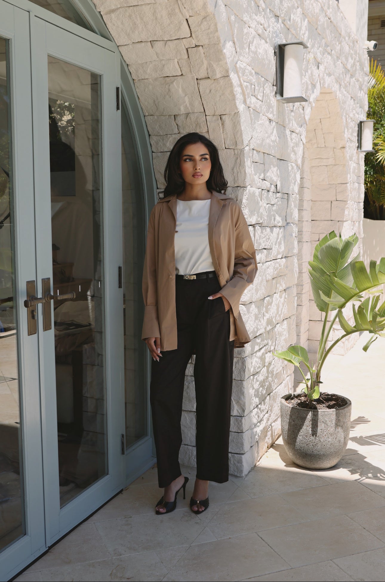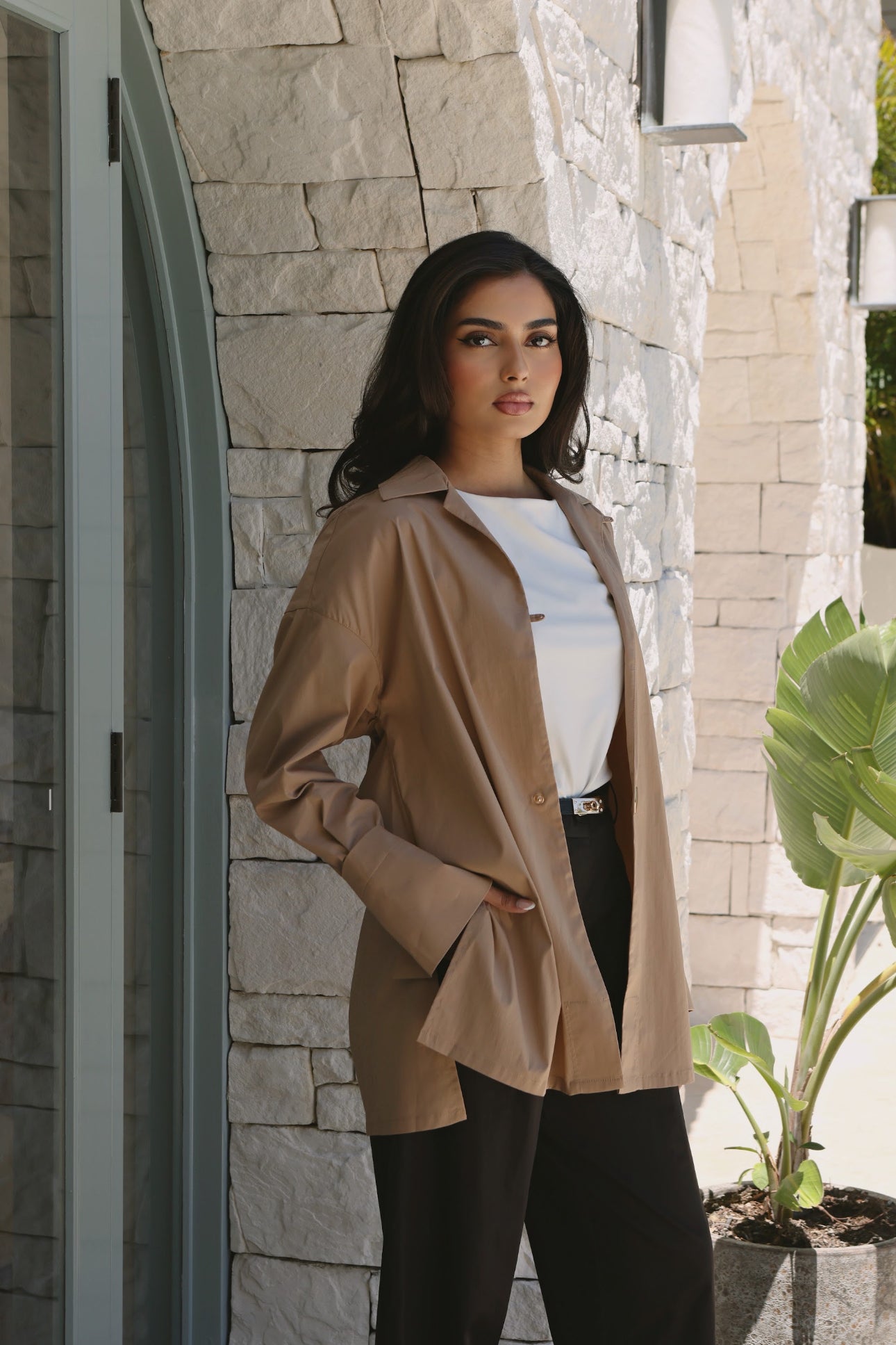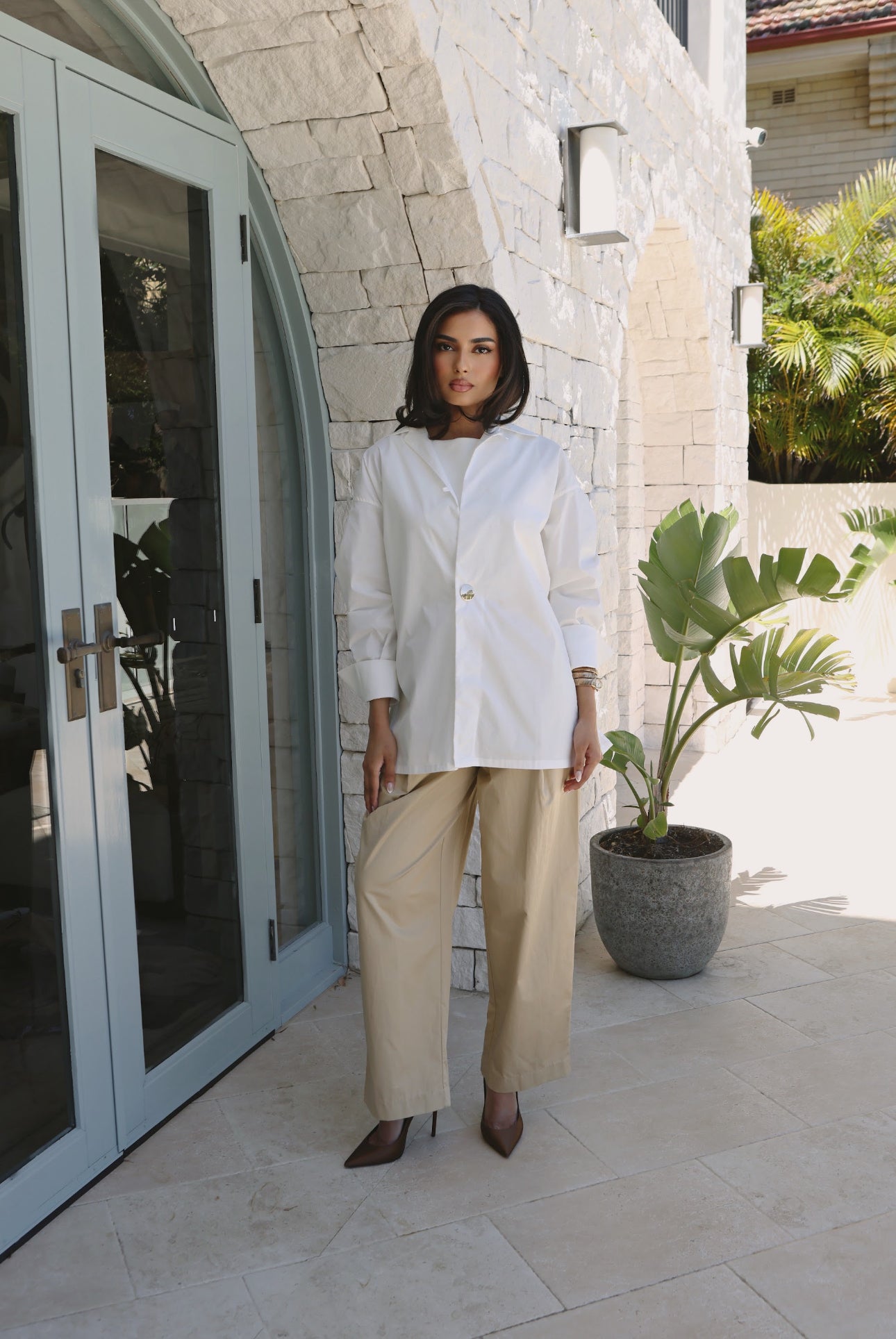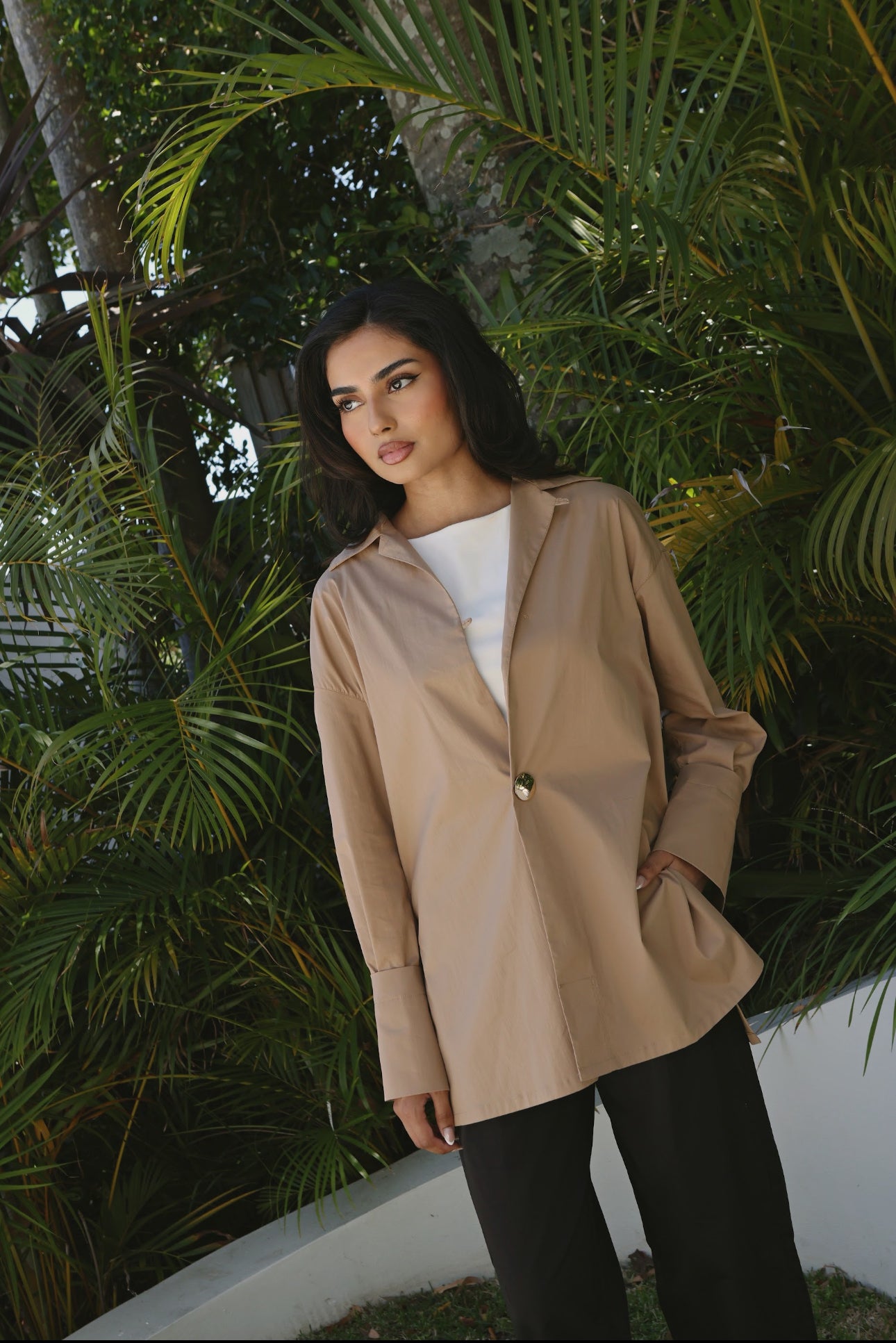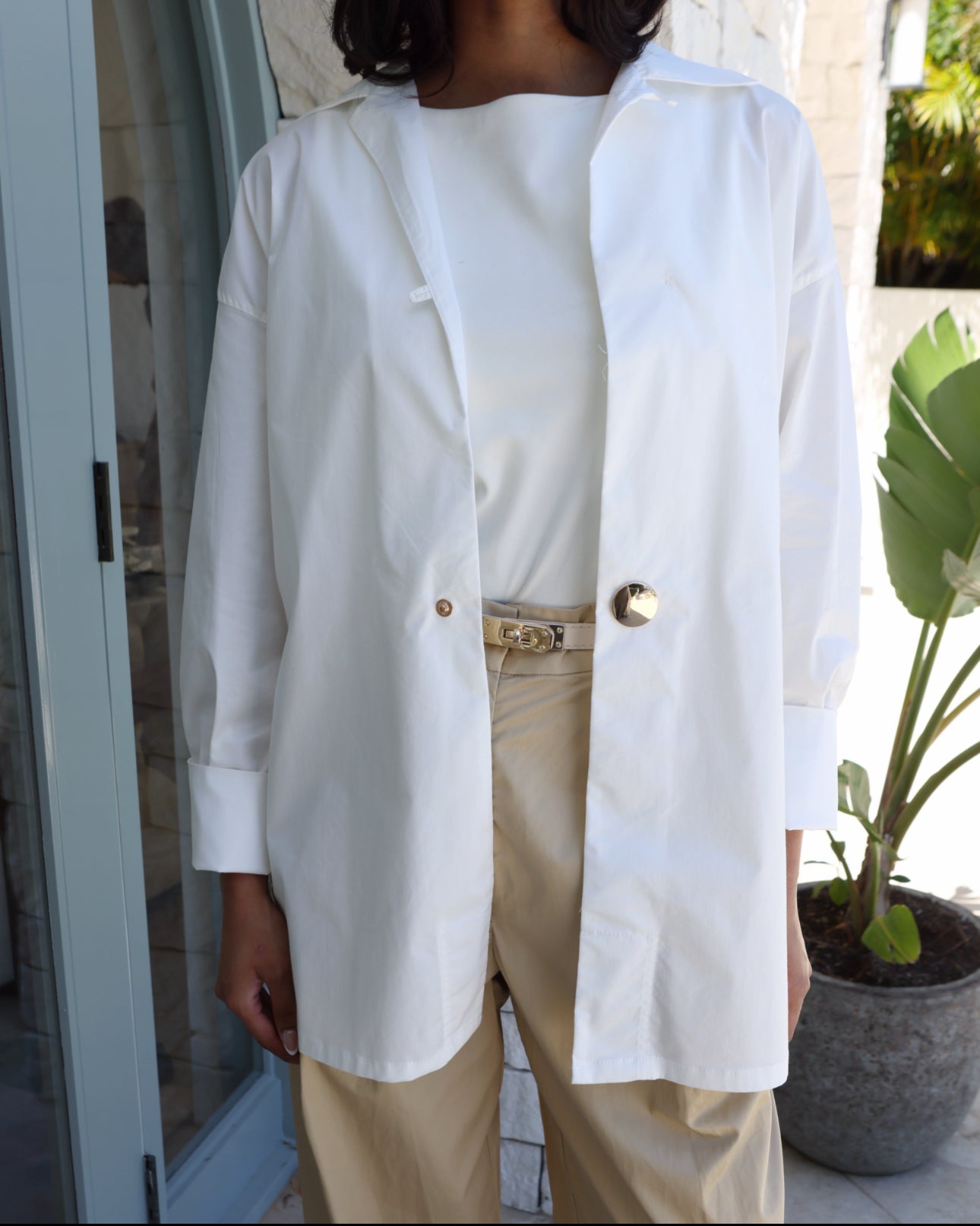 A study in understated elegance. The Élan Shirt is crafted from a breathable linen–cotton blend. Its sharp collar and dropped shoulders create a modern, easy silhouette, while the single polished button closure offers a clean, refined finish. Designed to move seamlessly from day to night — wear it tucked, layered, or loose for quiet sophistication.