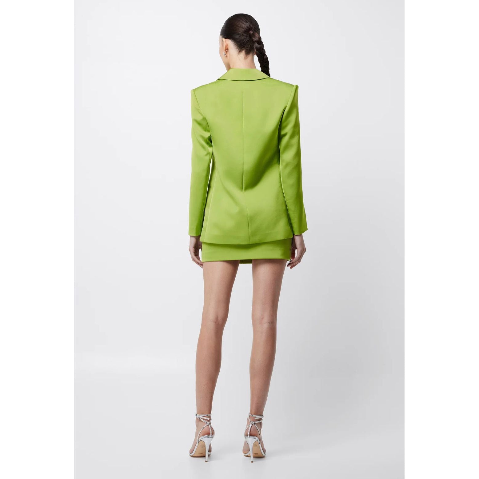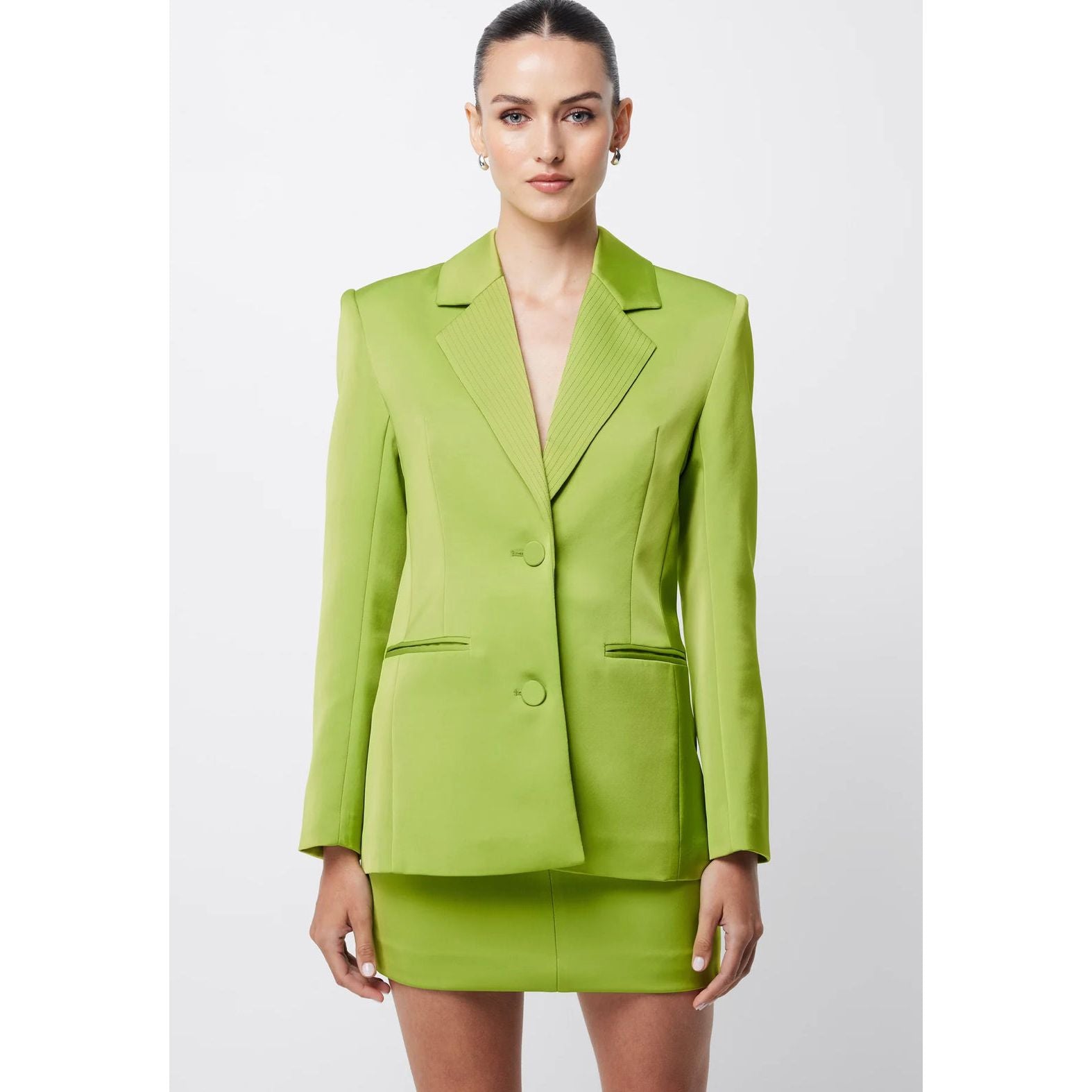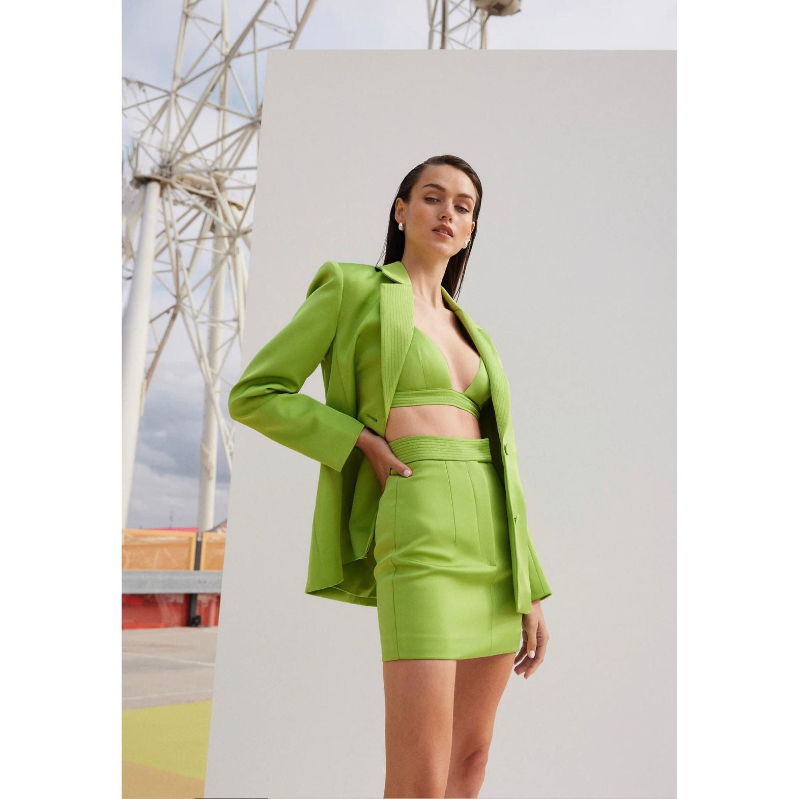 Crafted from a luxurious satin fabric, the Elysium Blazer in green is a contemporary choice for the warmer months. The tailored blazer accentuates the waist and showcases a single-breasted design and a structured collar with design seams. Style with the matching Elysium mini skirt and a metallic heel for your next party event.