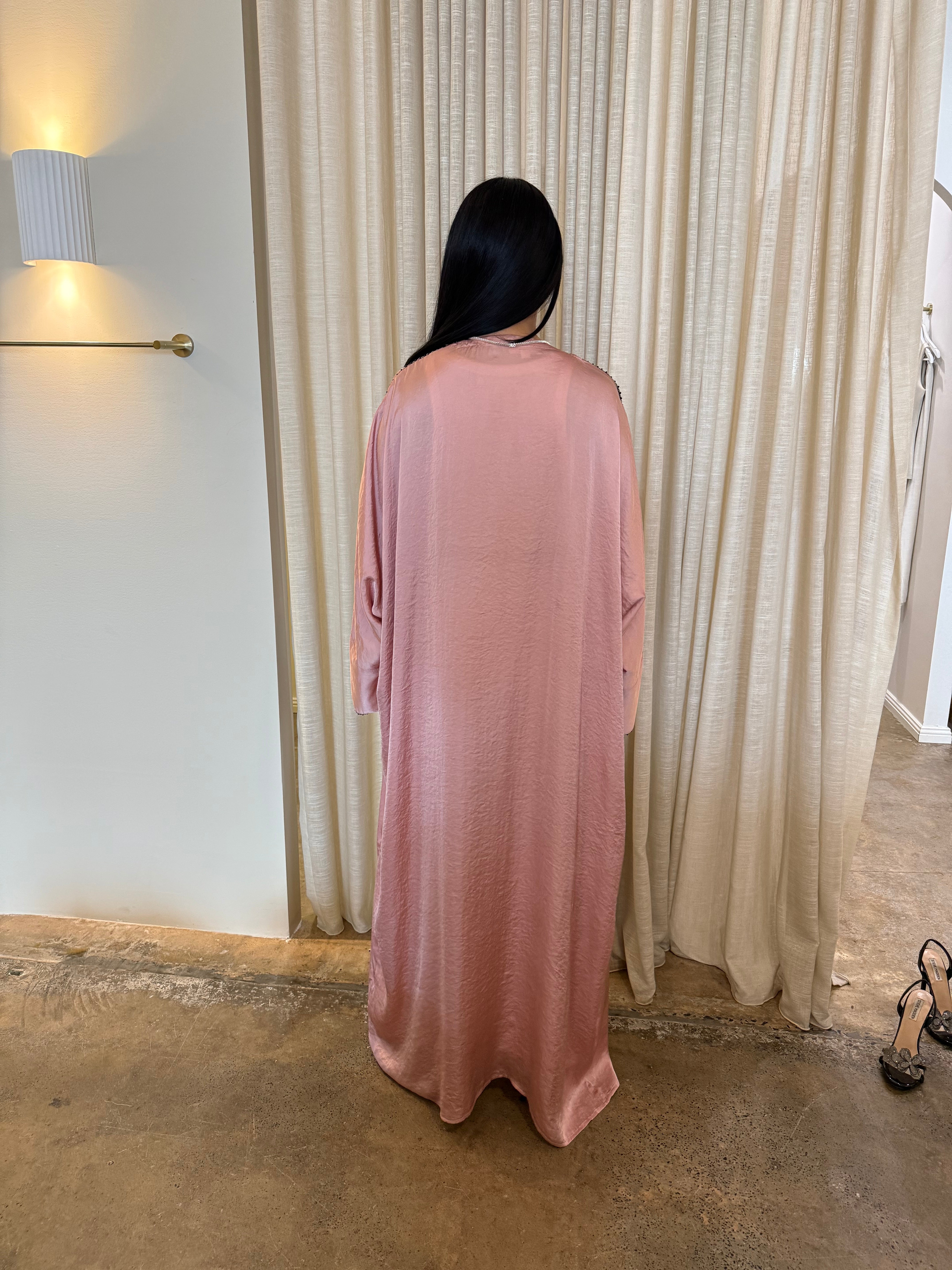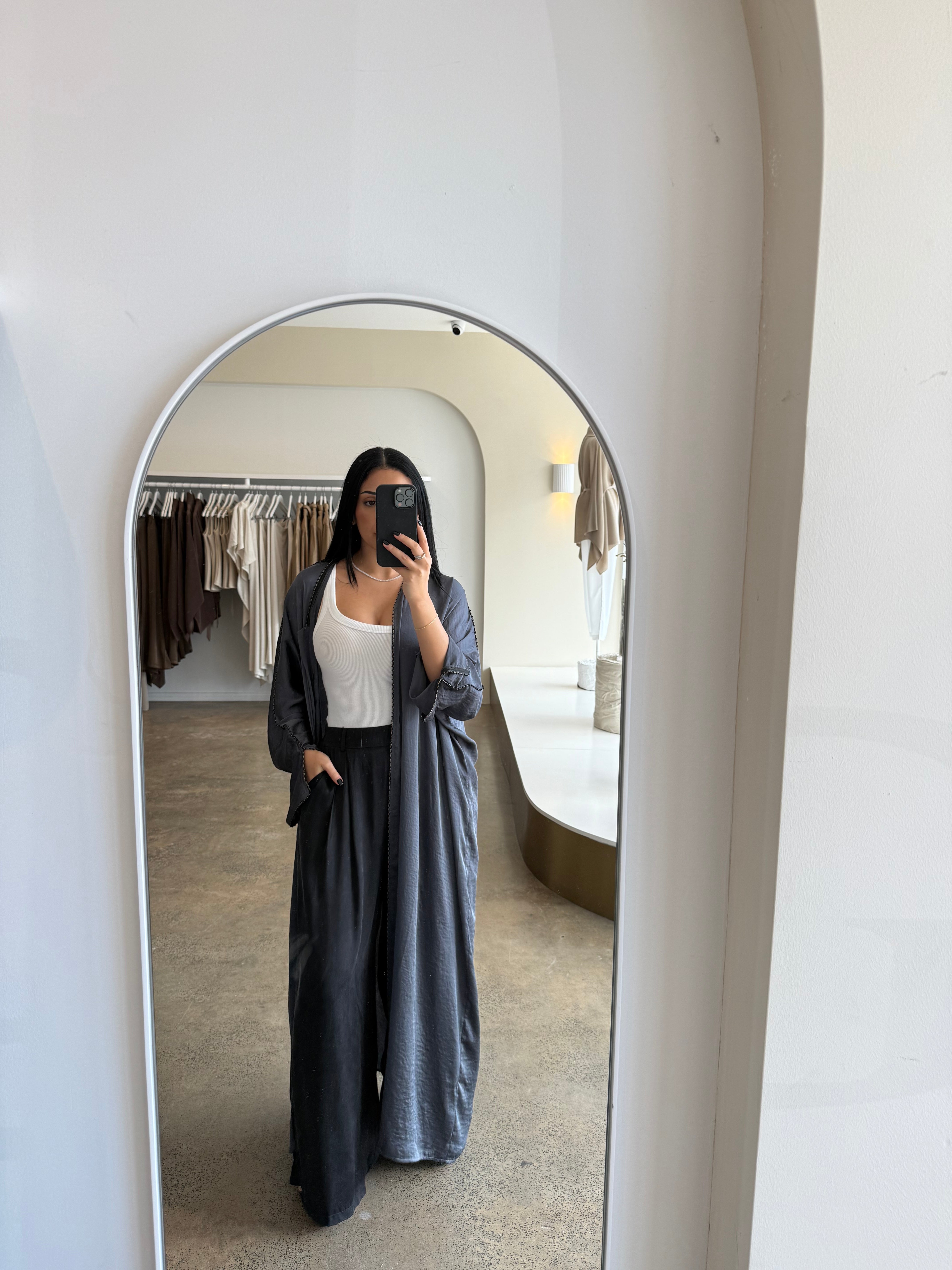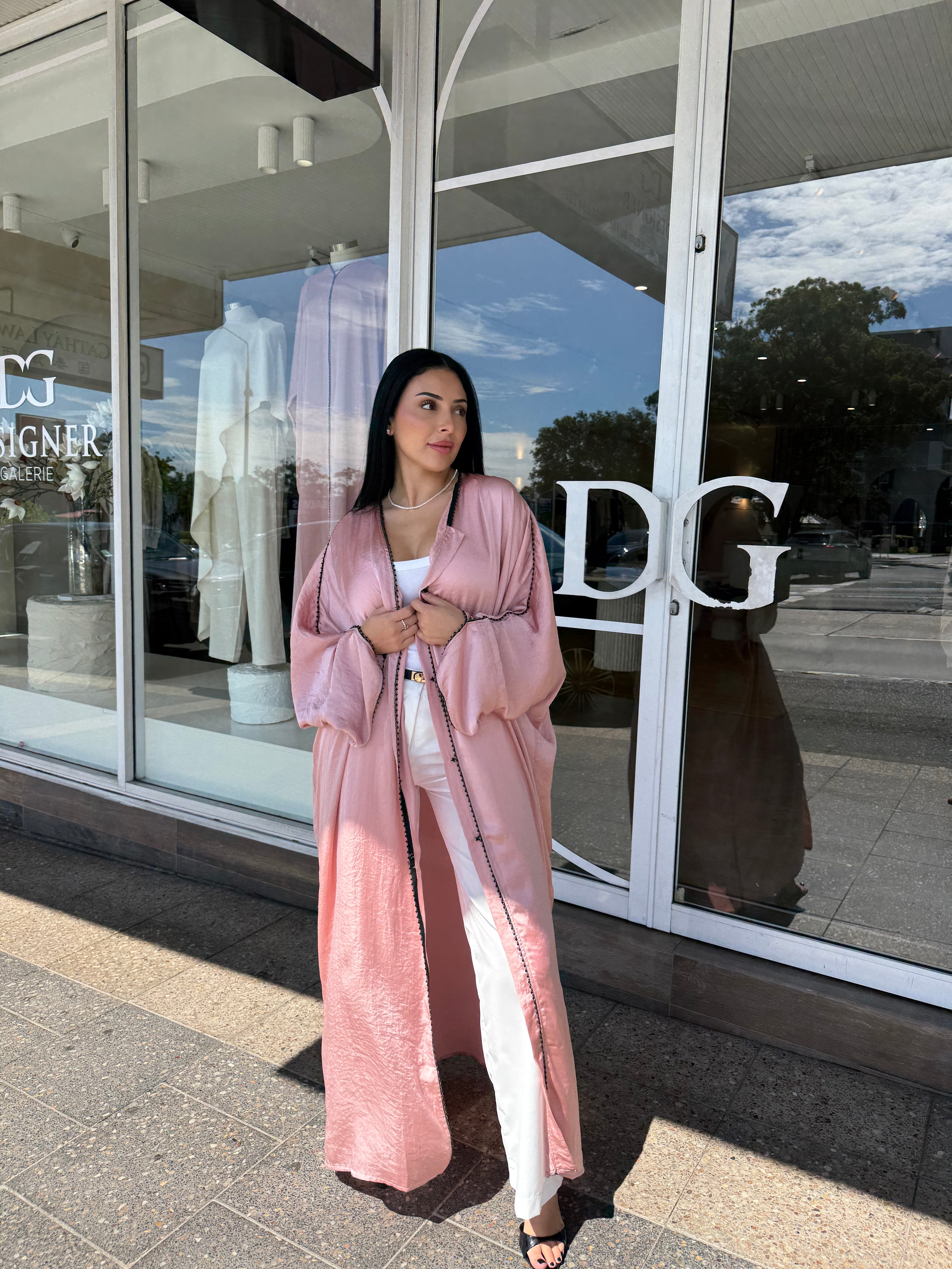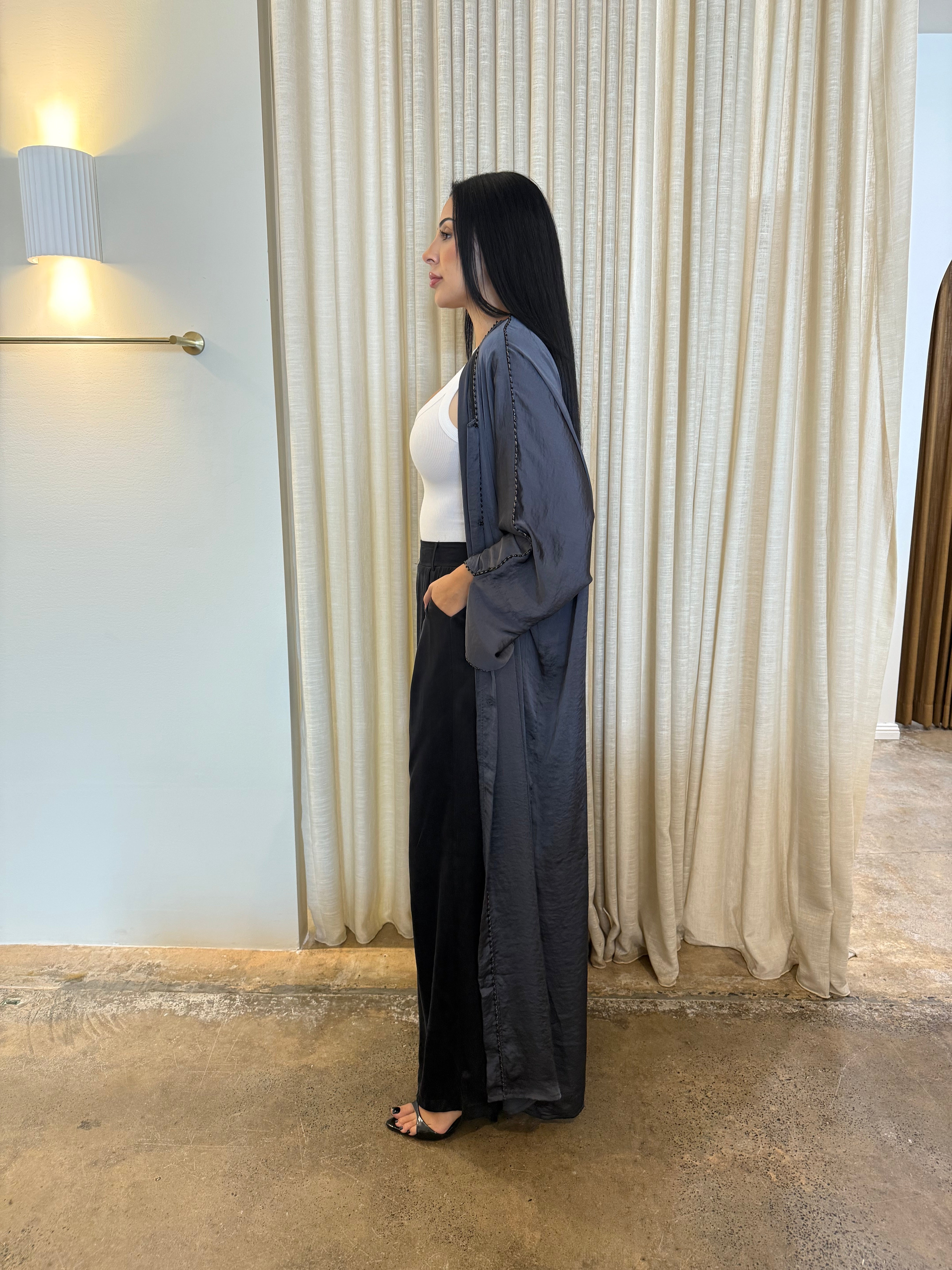 The Emara abaya from the Celeste collection radiates elegance with its flowing silhouette and luxurious fabric, complemented by matching pants for a coordinated, polished look. Designed for both comfort and sophistication, this ensemble transitions effortlessly from daytime refinement to evening allure. With its timeless design and graceful movement, Emara embodies poise for any occasion.