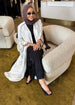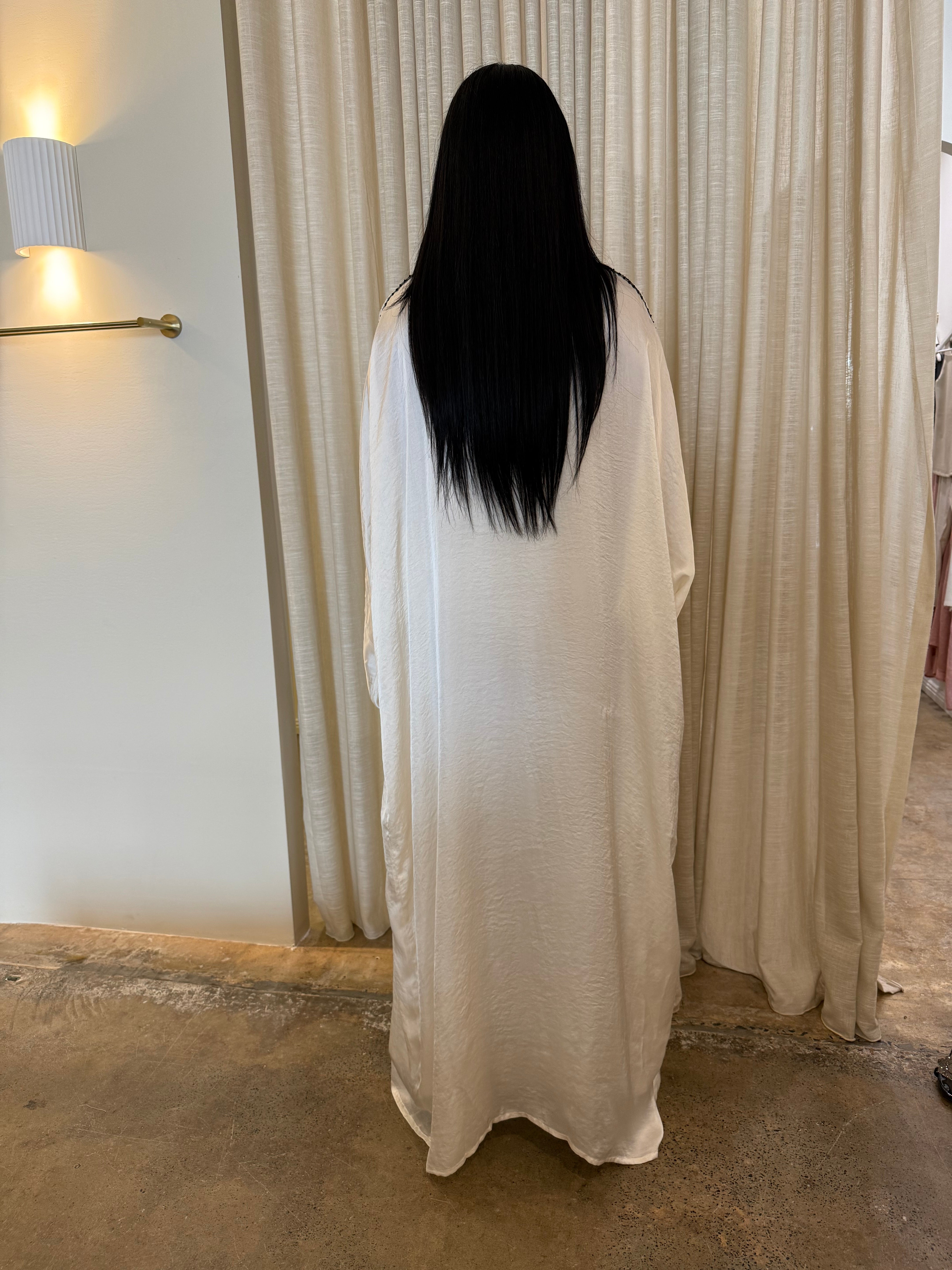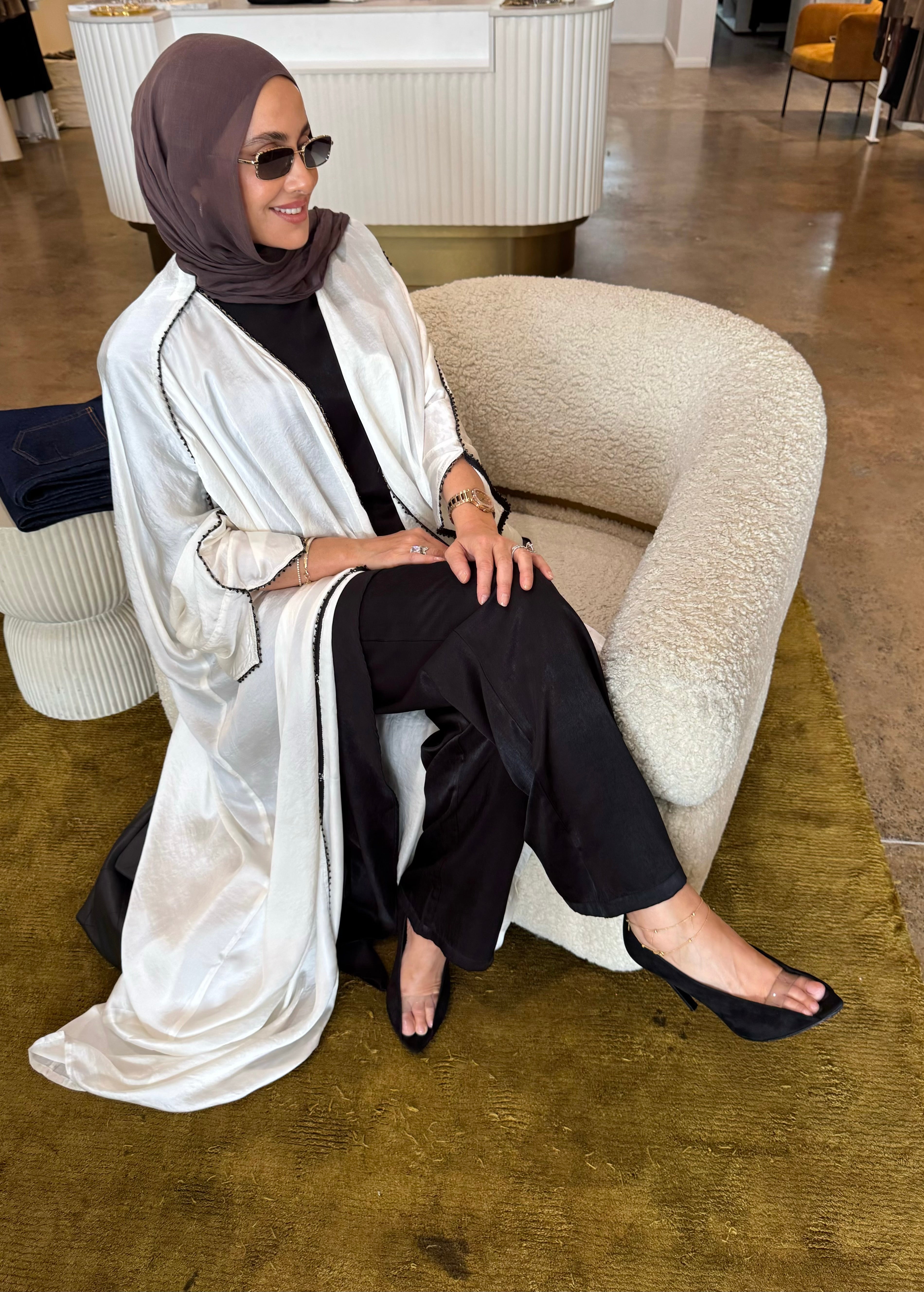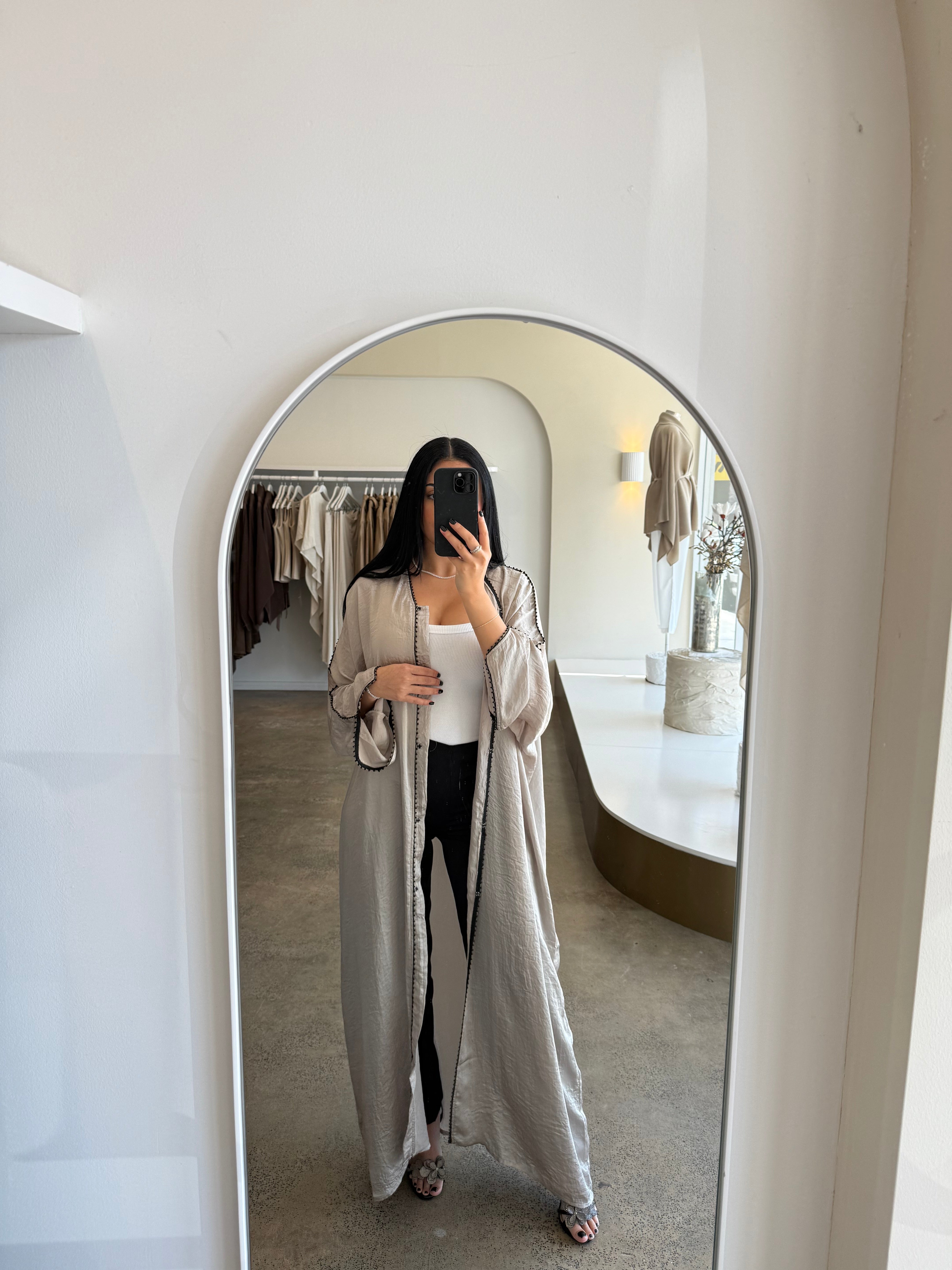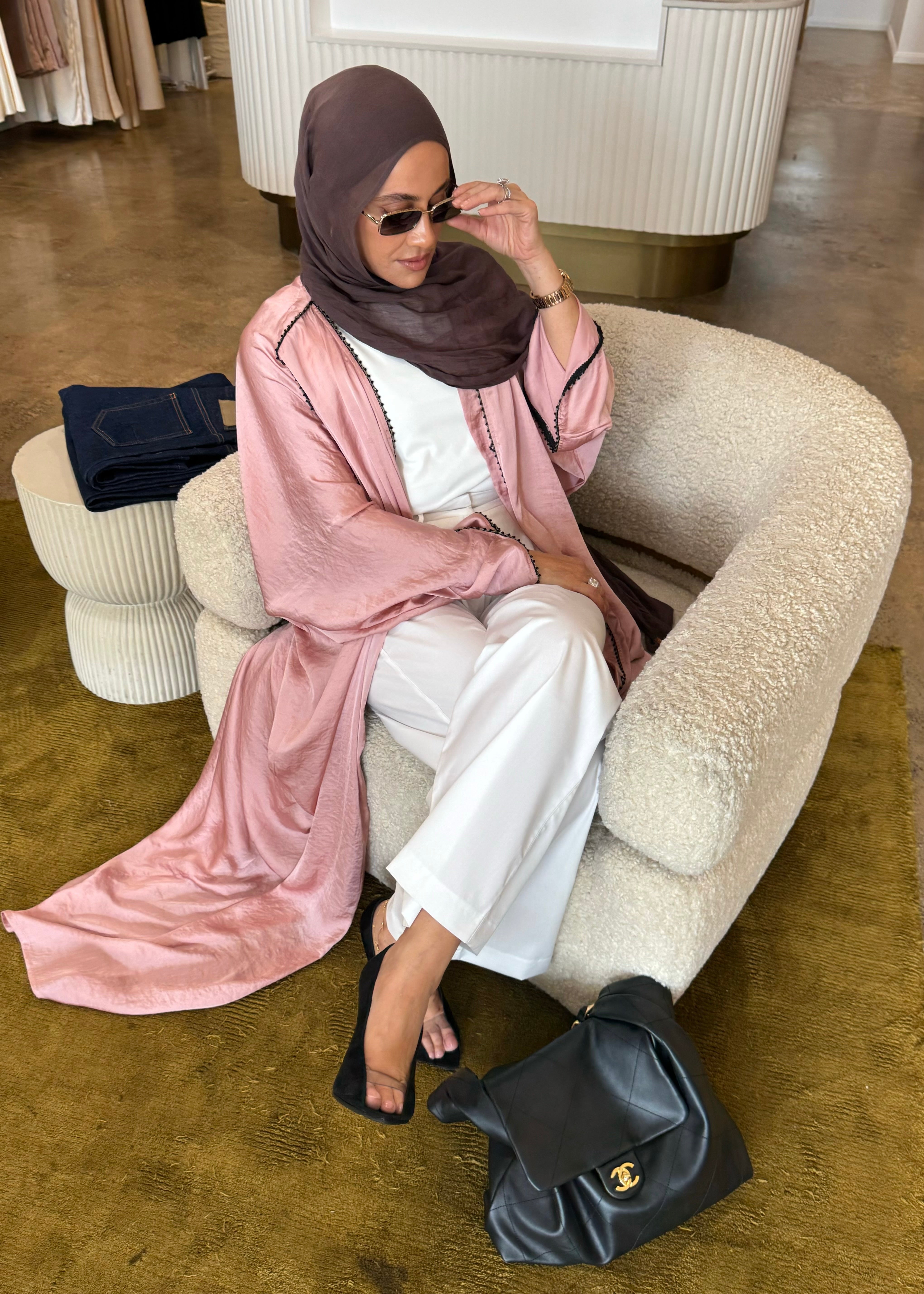 The Emara abaya from the Celeste collection radiates elegance with its flowing silhouette and luxurious fabric, complemented by matching pants for a coordinated, polished look. Designed for both comfort and sophistication, this ensemble transitions effortlessly from daytime refinement to evening allure. With its timeless design and graceful movement, Emara embodies poise for any occasion.