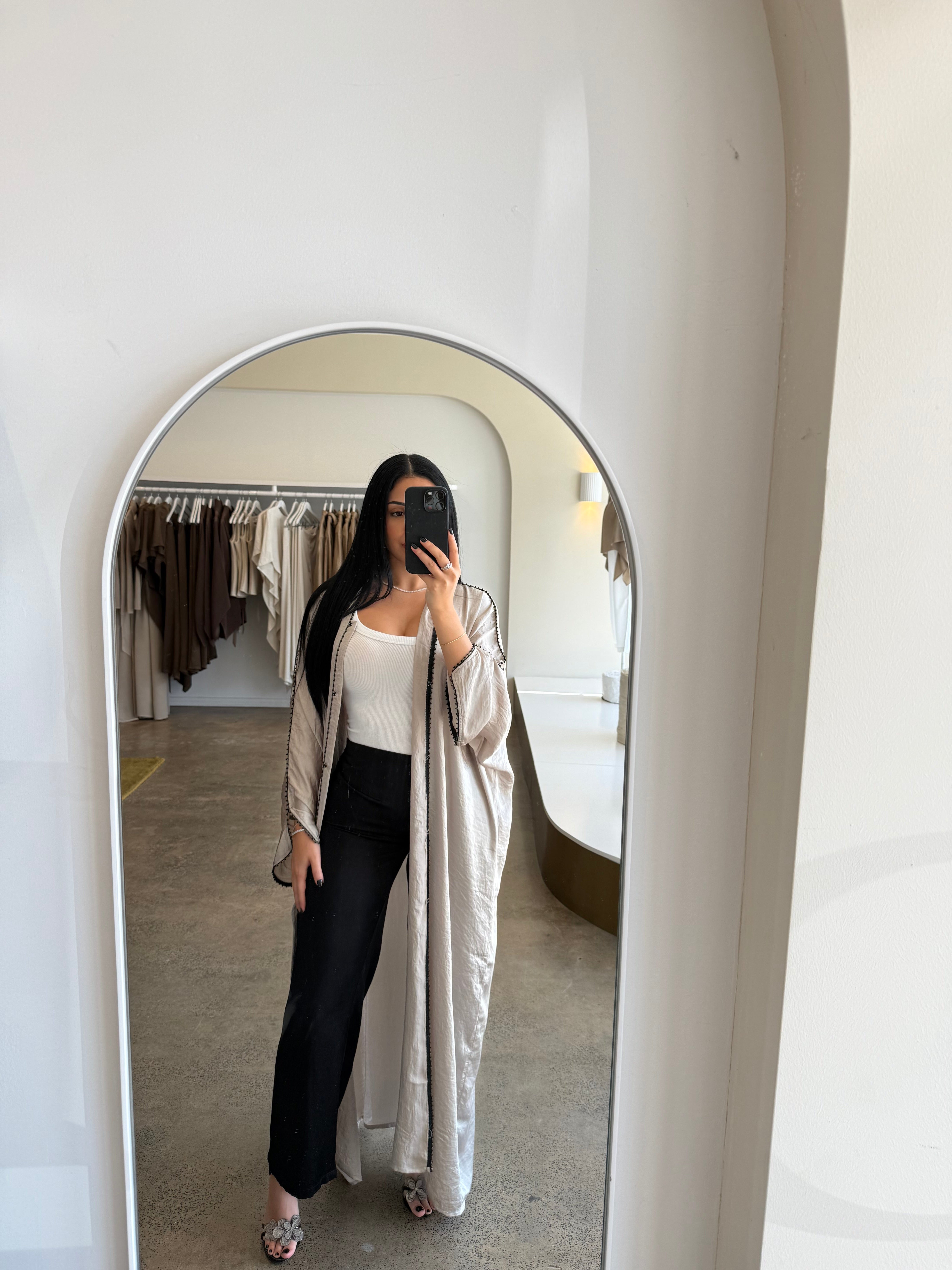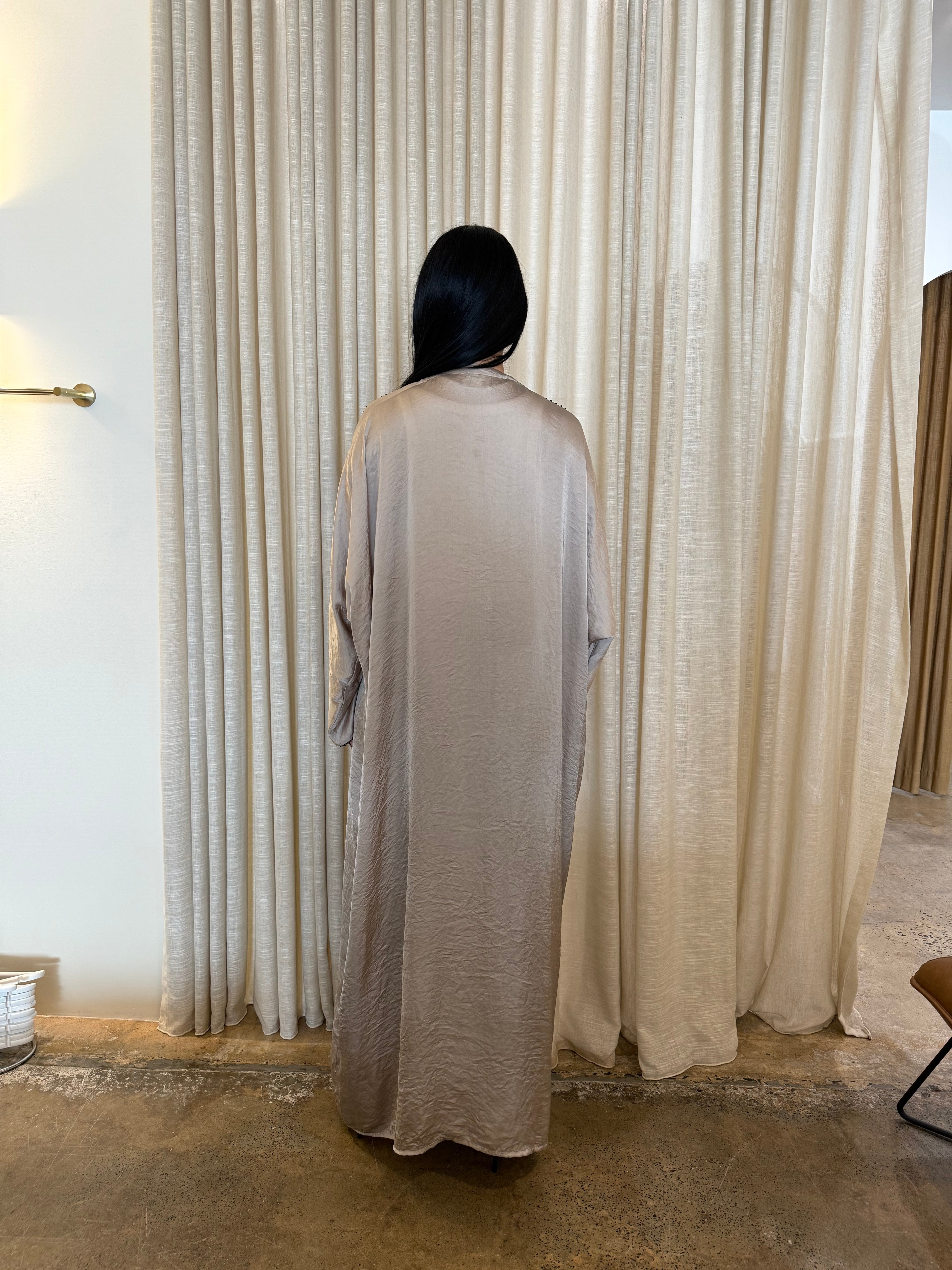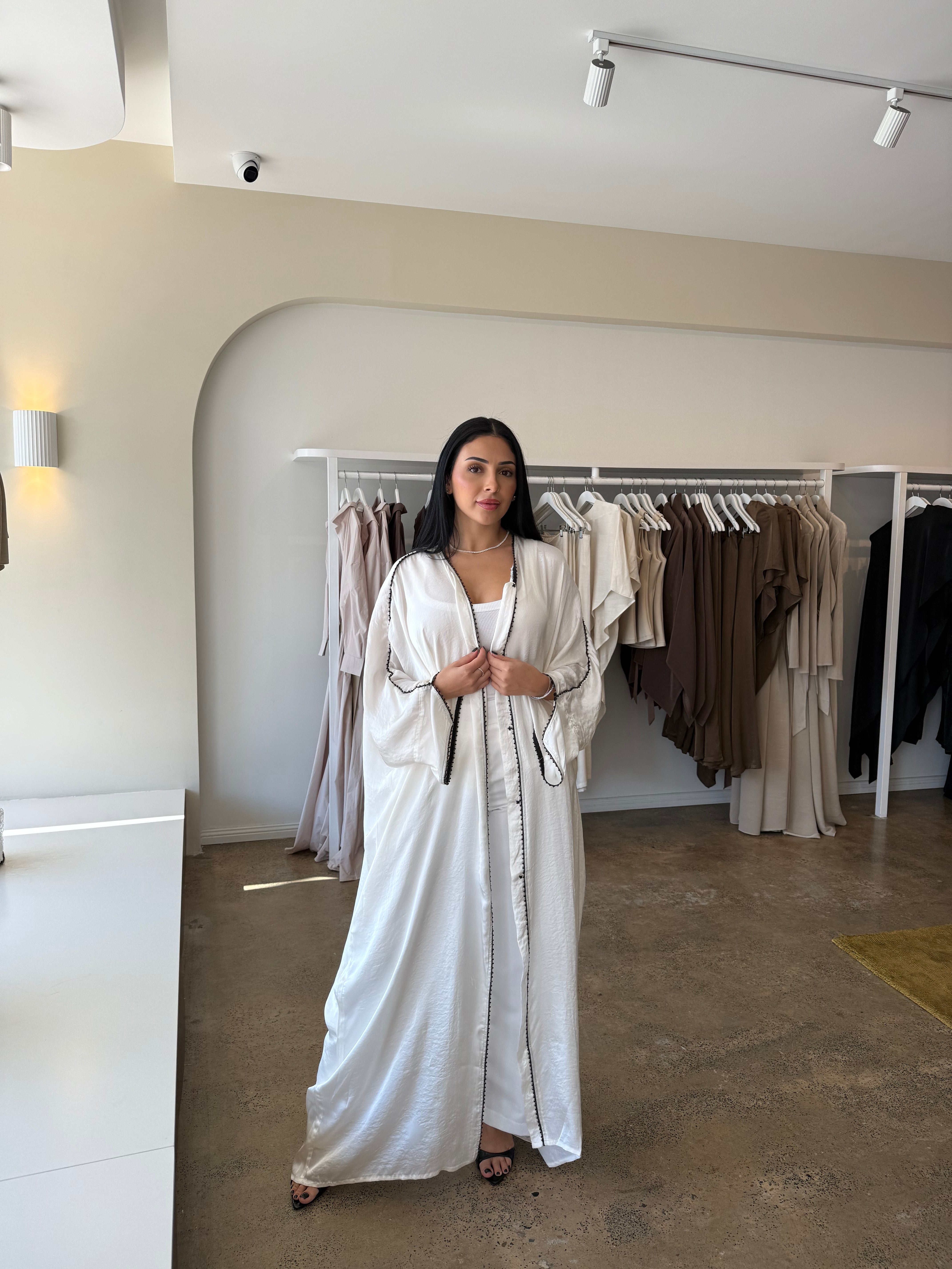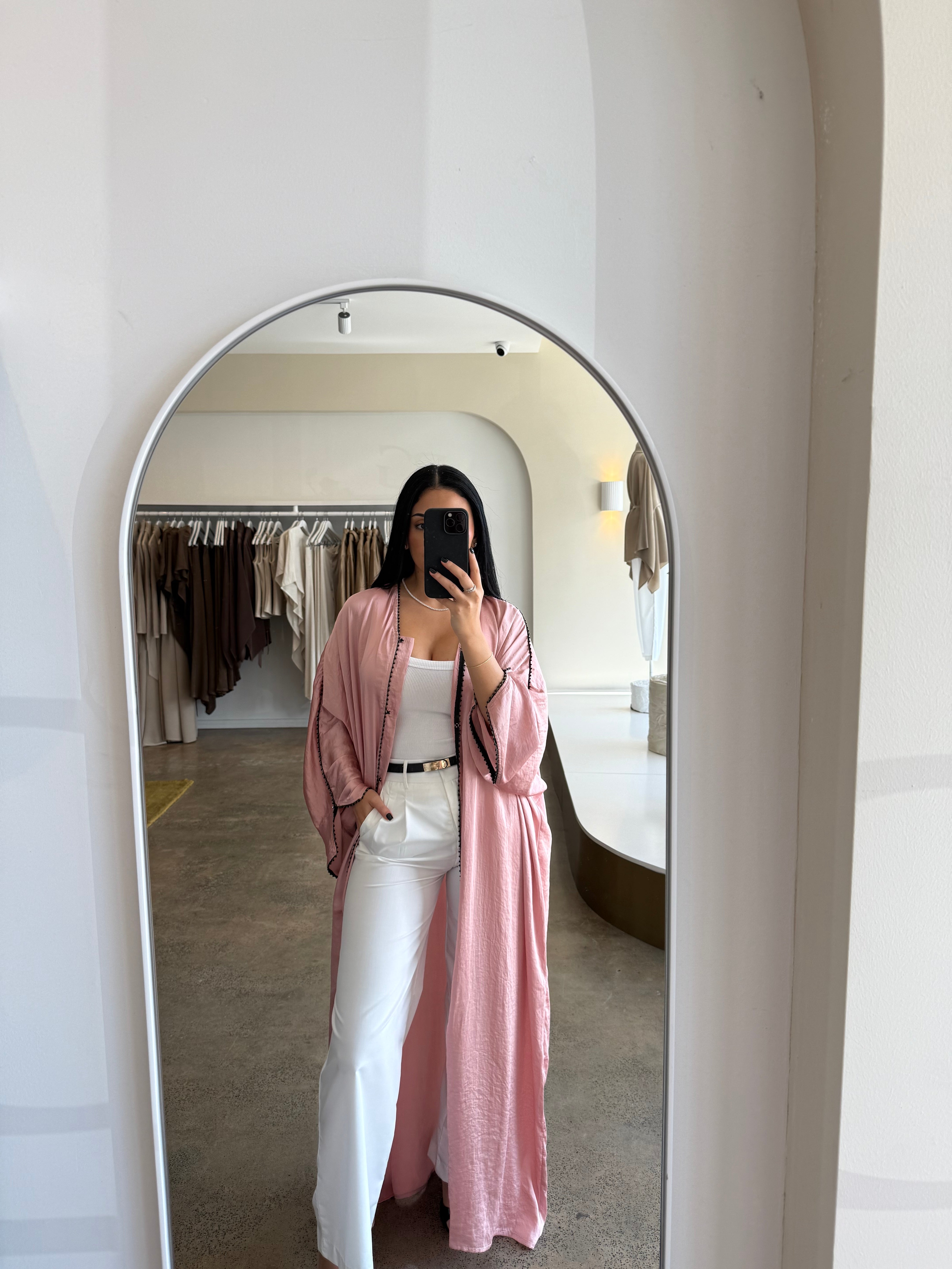 The Emara abaya from the Celeste collection radiates elegance with its flowing silhouette and luxurious fabric, complemented by matching pants for a coordinated, polished look. Designed for both comfort and sophistication, this ensemble transitions effortlessly from daytime refinement to evening allure. With its timeless design and graceful movement, Emara embodies poise for any occasion.