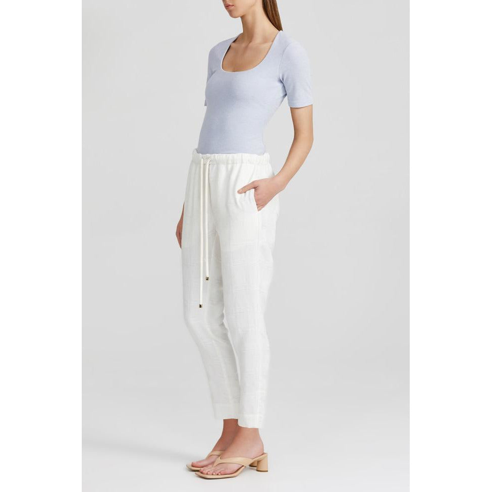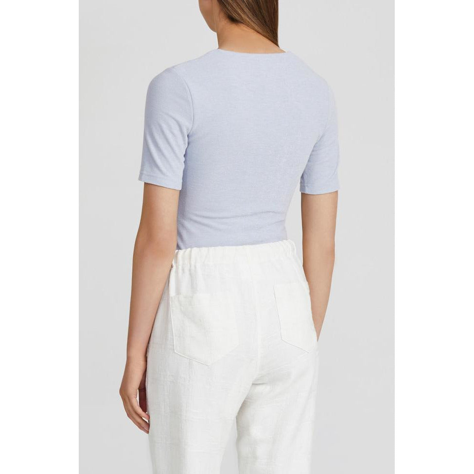 The Highfield Top in Sky is cut to be fitted throughout. Scoop neckline, short sleeves and slight gathering at the side seam, this style is the perfect staple for tucking into your favourite pant. Style back with Reece Pant in Natural or Florence Denim Jean. Also available in Nougat and Black.