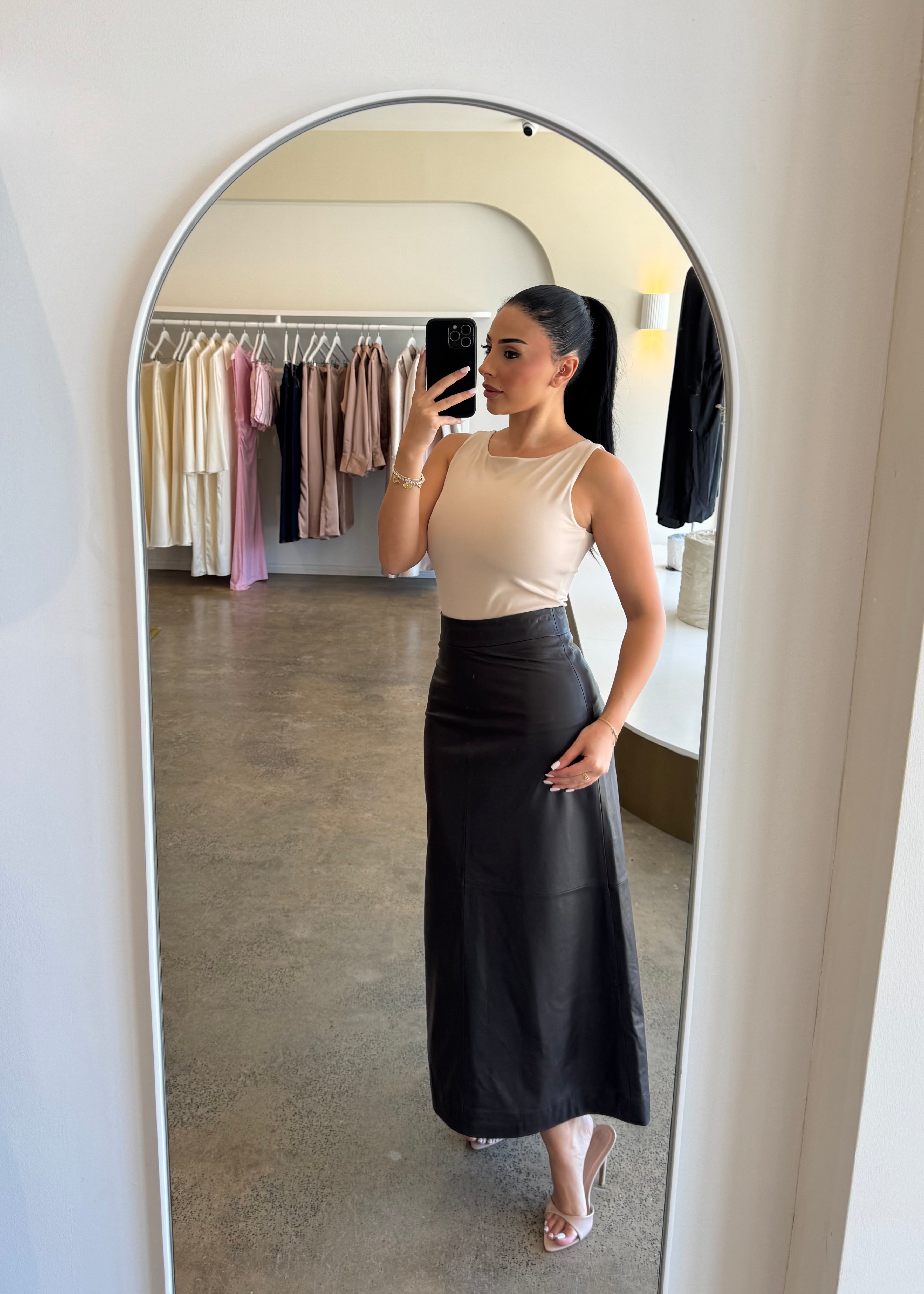 The Mirage Leather Maxi Skirt is a captivating and elegant addition to any wardrobe. Crafted from premium leather, this skirt features a flattering A-line silhouette that elongates the body and exudes sophistication. With its sleek design and versatile styling options, "The Mirage" is perfect for both formal occasions and everyday wear. Pair back with the Mire Leather Trench or pair it with a cozy sweater and boots for a more casual ensemble. Effortlessly chic and endlessly versatile, "The Mirage Leather Maxi Skirt" is sure to make a statement wherever you go.
