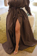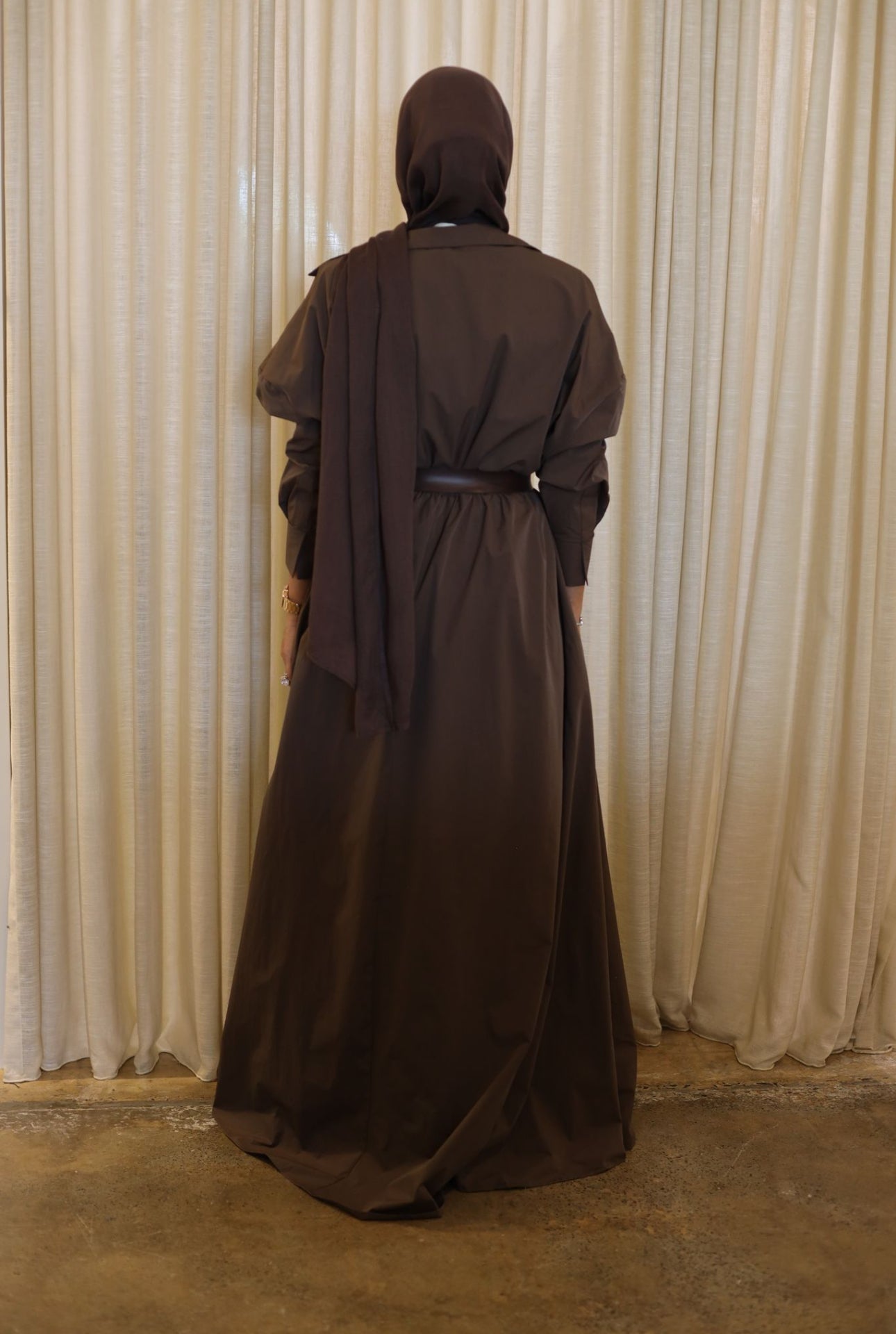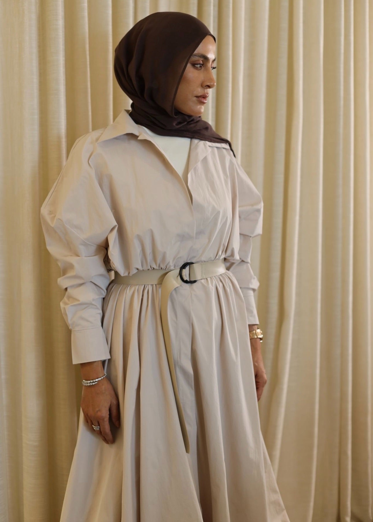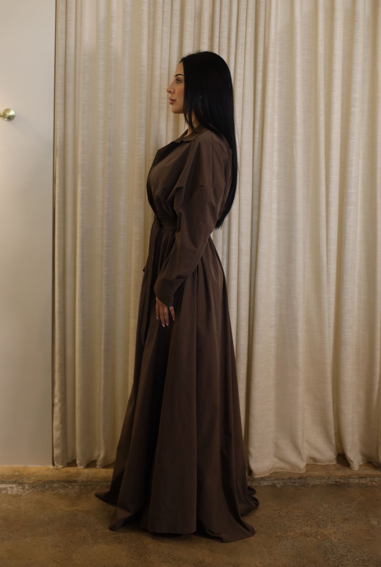 The Monarch Gown is the defining masterpiece of the collection. Designed to command presence, this statement piece features a dramatic oversized collar and a low neckline that balances strength with elegance. Long sleeves are finished with adjustable velcro tab closures, allowing the silhouette to be worn open or secured for a more structured look. Crafted with generous volume, the gown cinches at the waist and is further defined with a leather belt, before flowing effortlessly to the floor in a striking, gown-length silhouette. Powerful, refined, and unapologetically bold, the Monarch Gown is made for moments that demand impact.