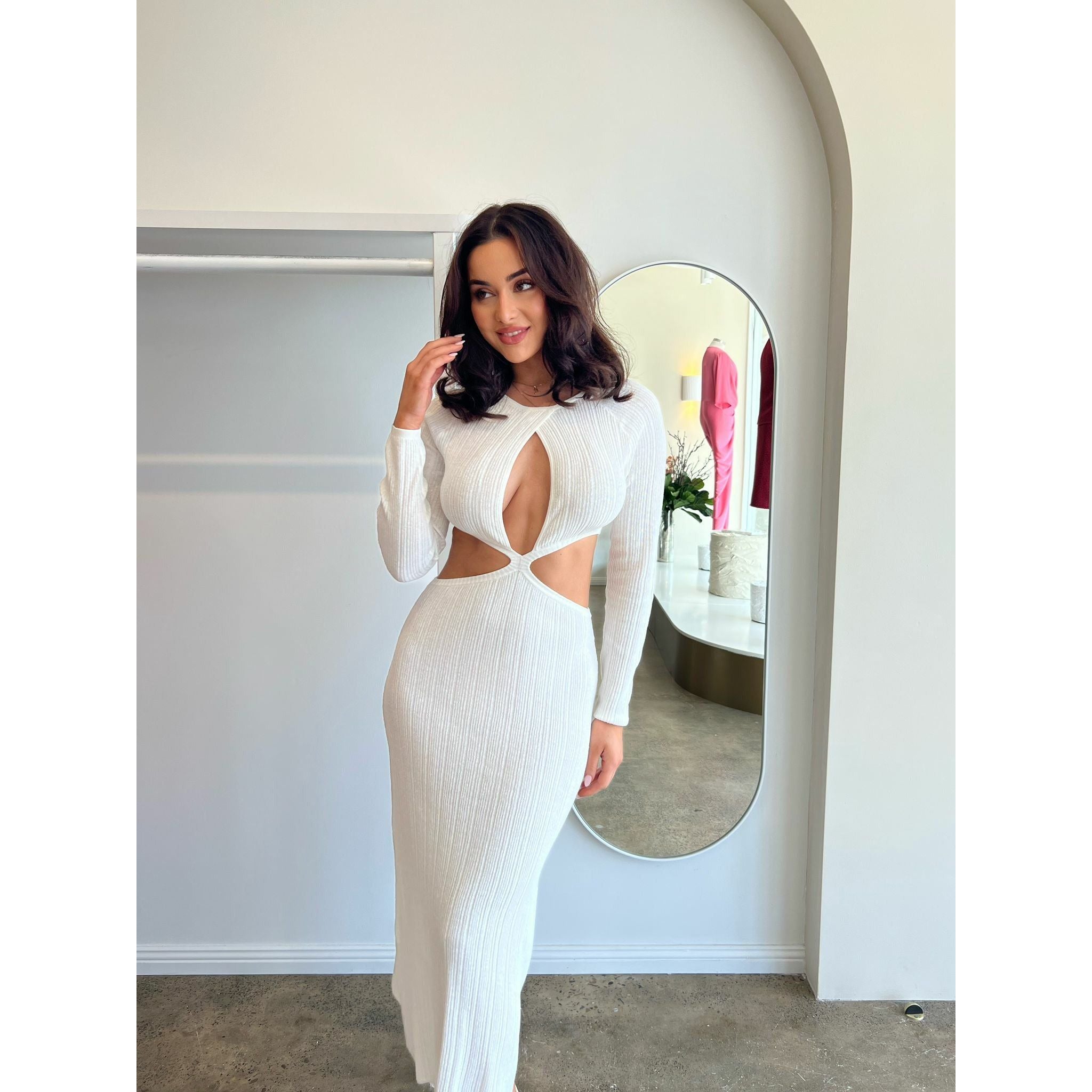 Crafted from a luxurious silk blend, The New Dimensions Cut Out Knit Dress is perfect for the party season in the cooler months. Crafted in a fresh white and detailed with a directional ribbing, the cut-out maxi dress features long sleeves and an A-line skirt which finished just above the ankles. We've styled ours with knee high leather boots and wavy hair for an edgy look. How would you style yours?