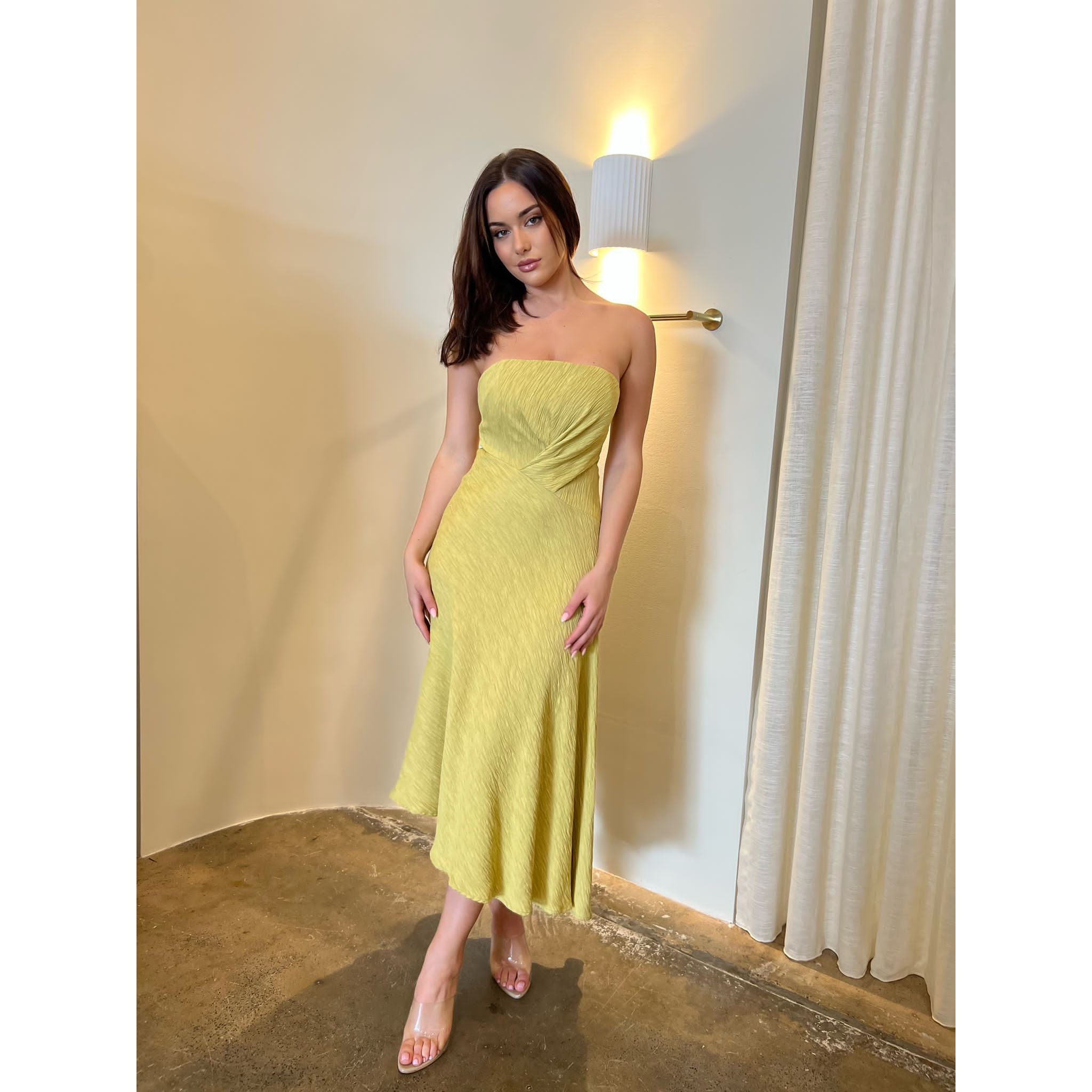 A highlight silhouette from Resort the Quartz Midi in now available in Golden Straw. Designed with a strapless silhouette this piece features a cross drape feature that under the bust. The skirt is cut on the bias stopping mid calf in a asymmetrical hemline.