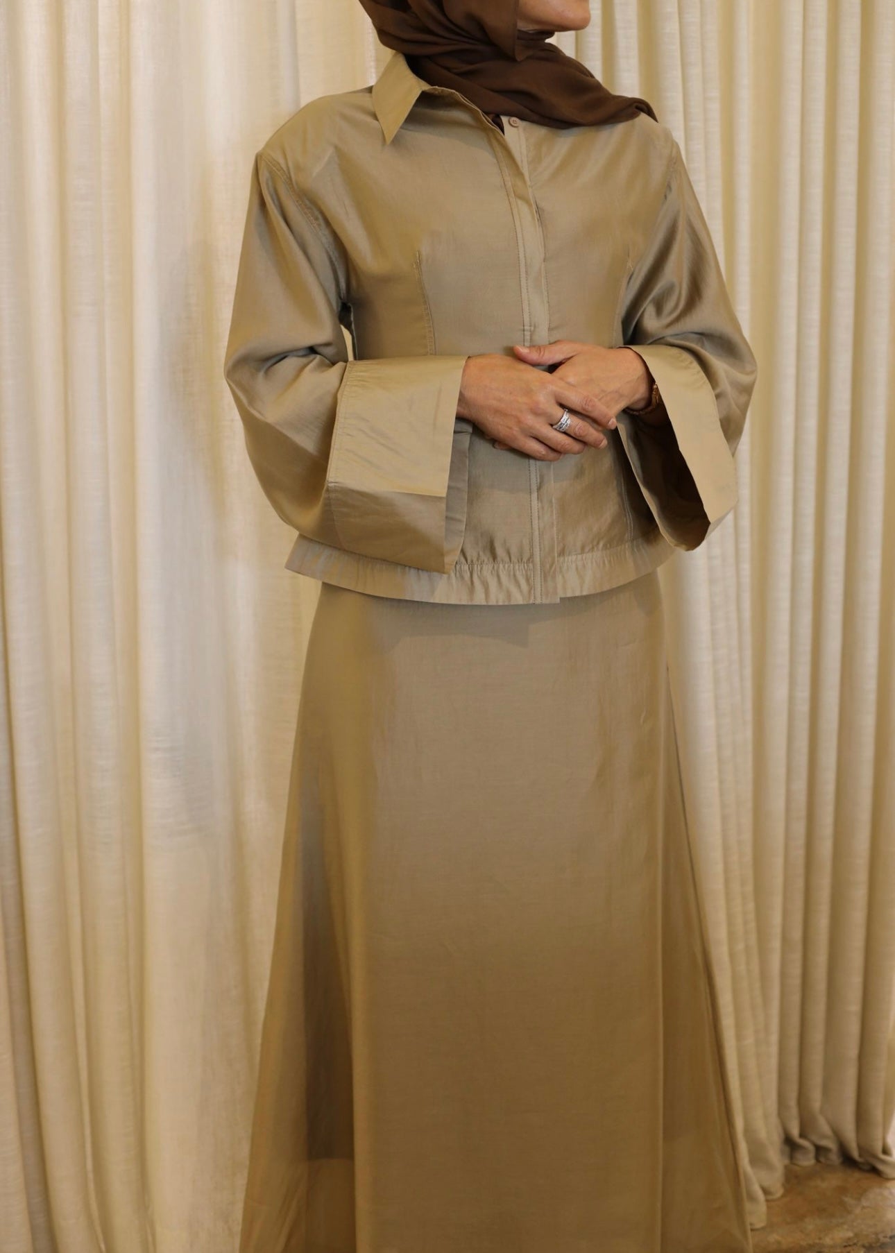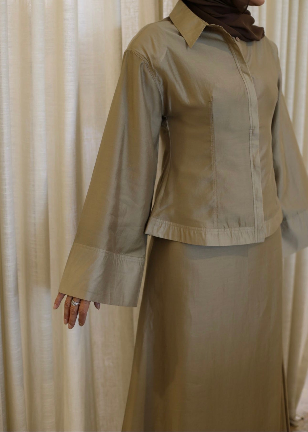The Silque Shirt is a refined expression of modern tailoring, designed to sculpt and flatter the silhouette. Beautifully placed darts softly cinch the waist, creating a defined shape, while an elegant collar and invisible button fastening maintain a clean, polished finish. Flared bell sleeves add subtle movement and femininity, and softly structured shoulder pads provide gentle definition without appearing dramatic. Designed to pair seamlessly with the matching Silque Maxi Skirt, this piece delivers an elevated, cohesive look.
