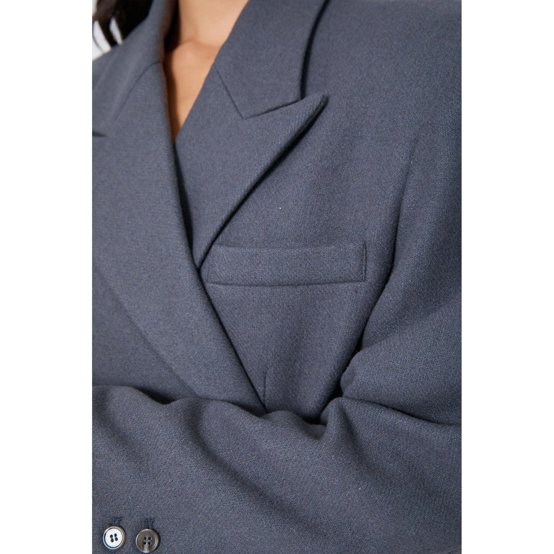 Double breasted blazer with collar and pointed lapel detail. Wide shoulder detailing, front chest welt pocket and hip flap pockets at front. Designed to style back with The Trouser in Stone.