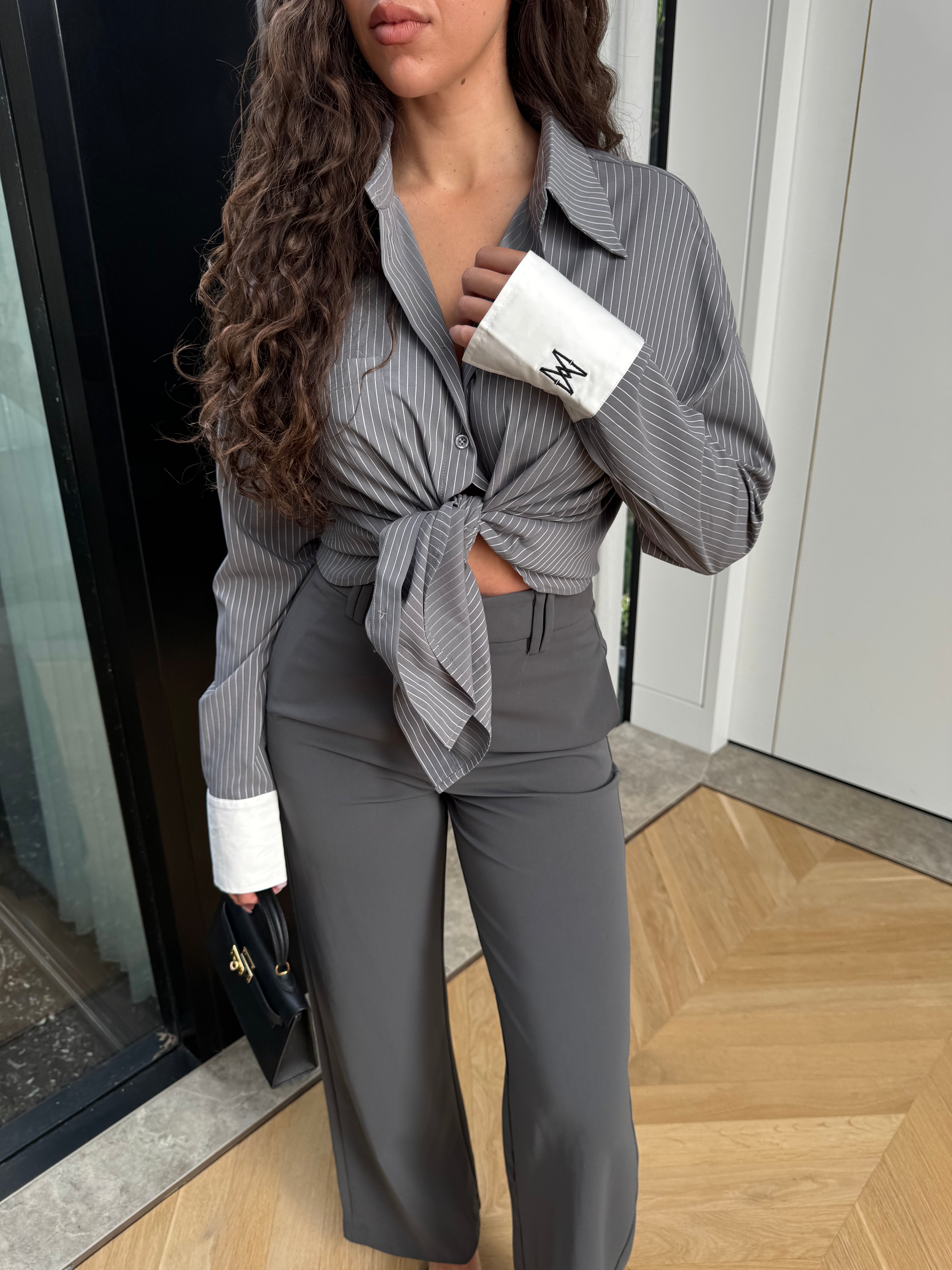 Charcoal high waisted pant  Double belt loop detail  Relaxed fit through leg  Side pockets Fly front closure with internal hook and bar closure  100% Polyester