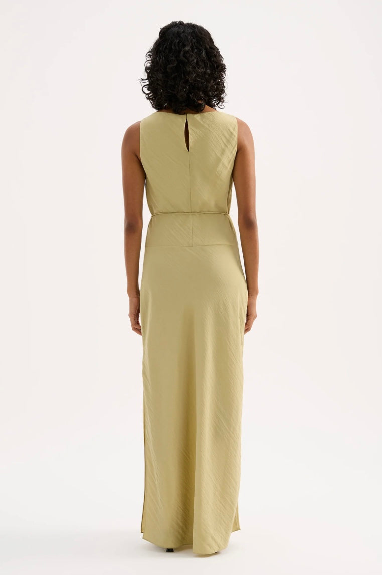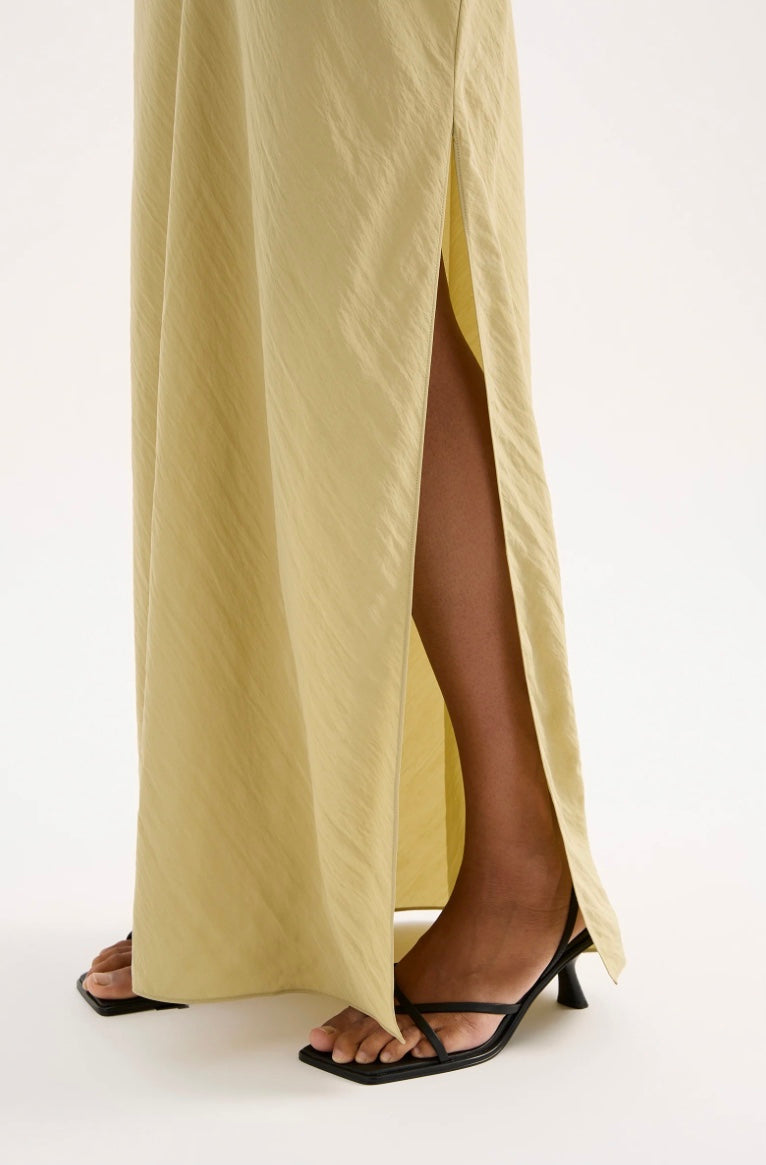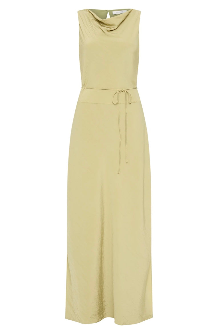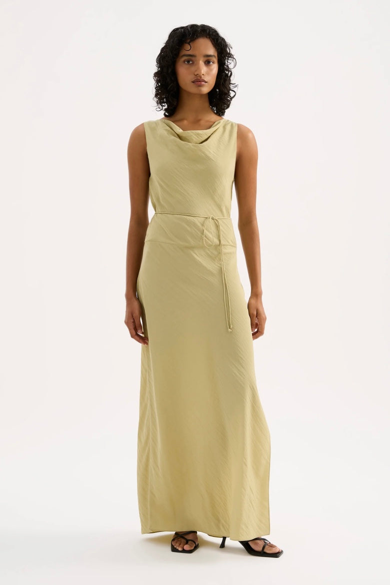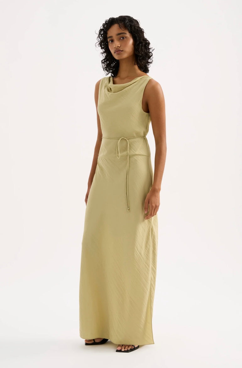 The Alia Maxi Dress is made from a viscose blend fabric which is lightweight and has a soft, textured hand feel. Cut on the bias, this silhouette drapes over the body softly and finishes at the ankles. Features include a soft cowl neckline, tie at waist and side seam slits.