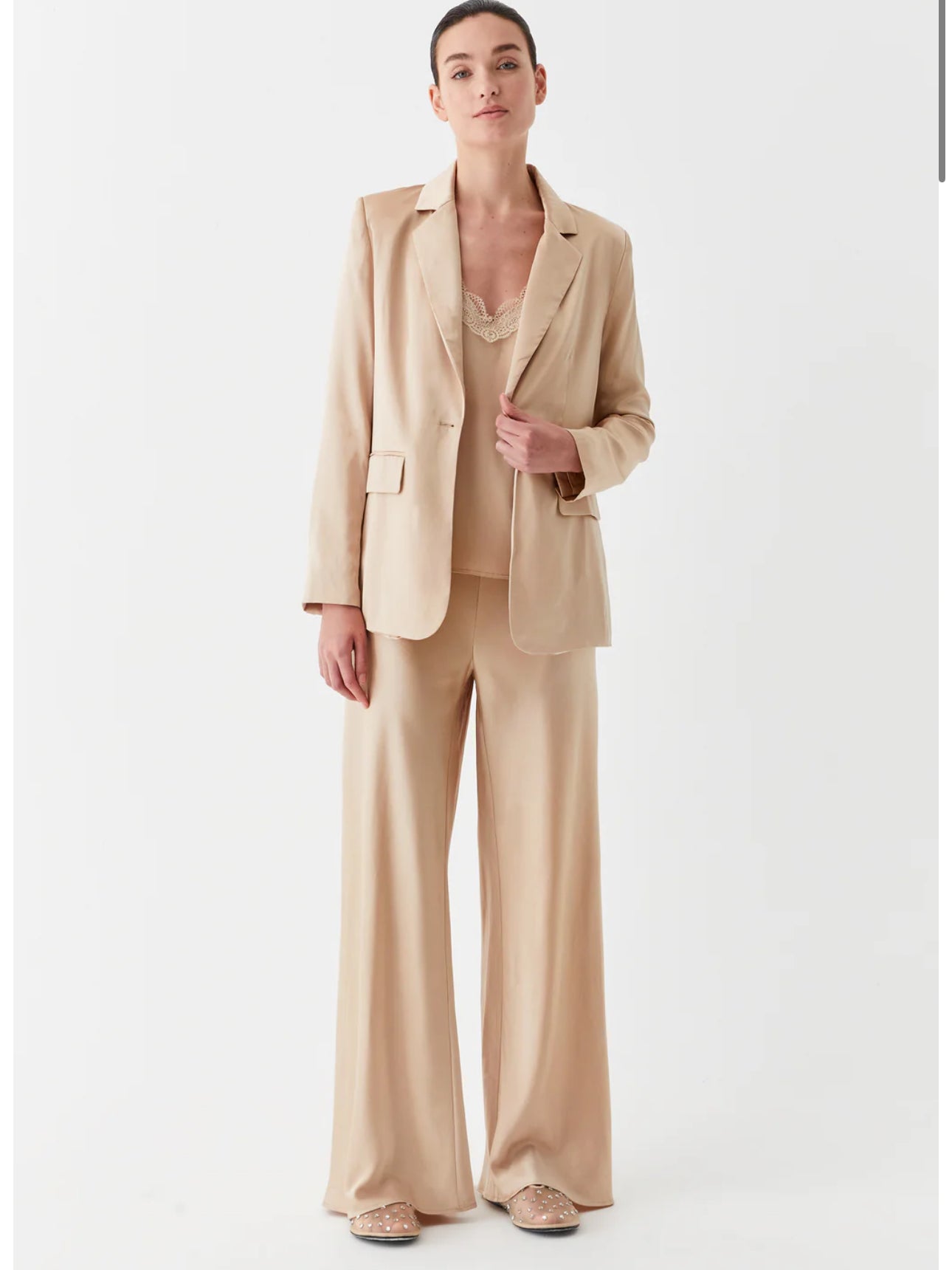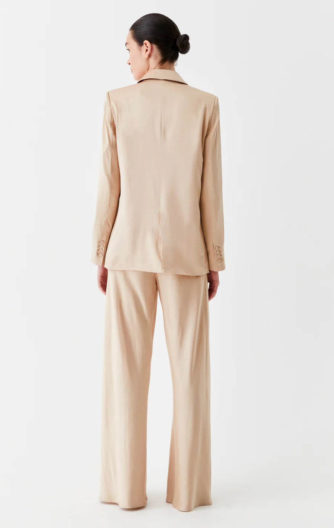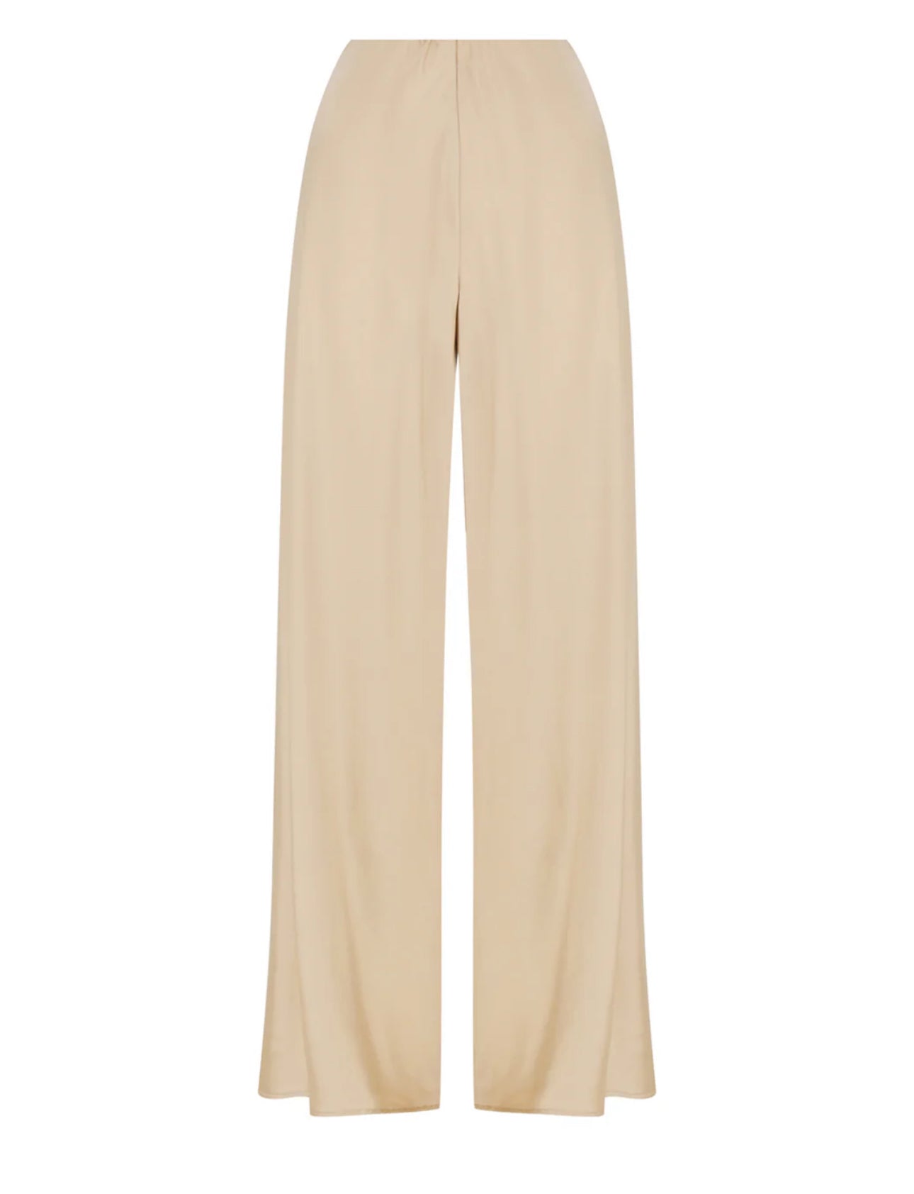Stretch Silk blend Concealed elastic waist Pull on Bias cut Straight leg Full length Model is Wearing:Size 1Style With:Violet Blazer Birch